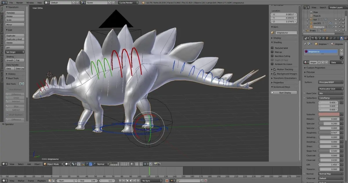 OverviewThis a dinosaur Stregosaurus from Jurassic period. The model is rigged, posed and ready for render. The mesh is fully made of quads, Uv unwrapped without overlapping UVs. The rig is handmade with IK system and custom shapes for important bones. Material was build with principled bsdf shader for Cycles render engine.The file is available in .blend .fbx with rig and .obj as well.