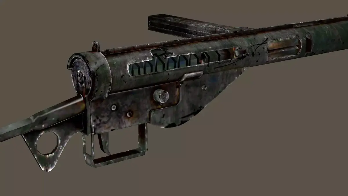 Sten Mk3 ww2 British smg pbr Low-poly 3D Model Chambered in 9x19mm, with a side mounted 32 round magazine, the Mk II fired at 500 rounds per minute and had an effective range of about 100 meters. Its crude, simple, utilitarian look, made it prone to jamming but deadly at close quarters