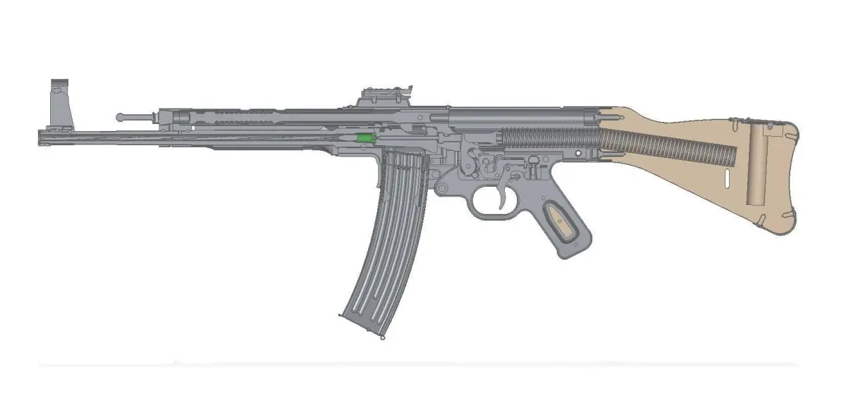 The StG 44 was the first successful assault rifle, with features including a relatively short cartridge, controllable automatic fire, a more compact design than a battle rifle with a quicker rate of fire, and intended for hitting targets within a few hundred metres. The StG 44 fulfilled its role effectively, particularly on the Eastern Front, offering a greatly increased volume of fire compared to standard infantry rifles. And 7.92×33mm Kurz (maded using blueprints) is a rimless bottlenecked intermediate rifle cartridge developed in Nazi Germany prior to and during World War II. The ammunition is also referred to as 7.9mm Kurz (German: Kurz meaning short), 7.9 Kurz, 7.9mmK, or 8×33 Polte. It was specifically intended for development of the Sturmgewehr 44 (assault rifle). The round was developed as a compromise between the longer 7.92×57mm rifle and the 9×19mm Parabellum pistol rounds, and is known as an intermediate cartridge (German: Mittelpatrone).