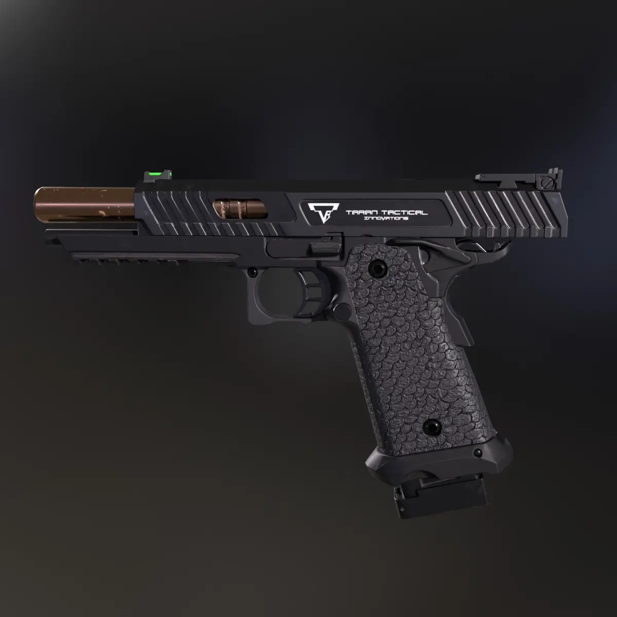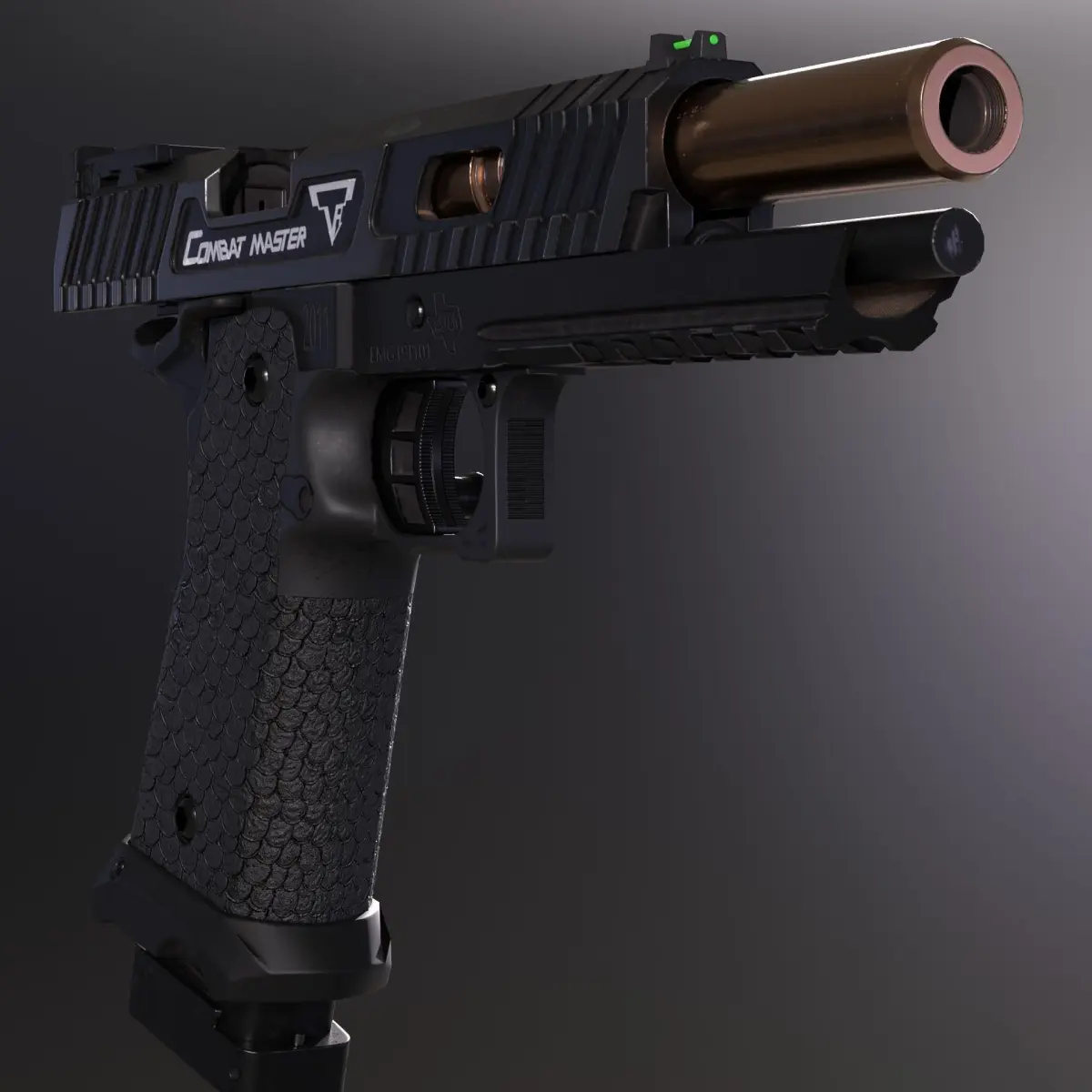 3d model of STI 2011 Combat Master inspired by John Wick movies. High-quality textures exported from Substance painter (.spp included). Textures: Base color, metallic, roughness, normal map, height map, AO (4K for the pistol material and 2K for the mag and a bullet). Naming convention (All the textures and mesh parts are properly named and easy to use).The gun is not rigged but easy to rig.Size: x: 45.9073 mm; y: 255.481 mm; z: 184 mmPolygon count: Oblects: 30 + Bullet (3 - objects); Vertices: 10.012; Edges: 20.790; Faces: 10.769; Triangles: 19.256;I hope you would like the model. Please contact me if you have any questions.