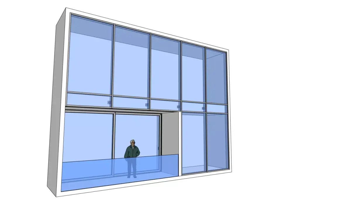 The design showcases a clean, contemporary aesthetic with thin structural mullions and high-transparency glazing. It includes a human scale figure to provide an immediate sense of proportion for your architectural scenes.