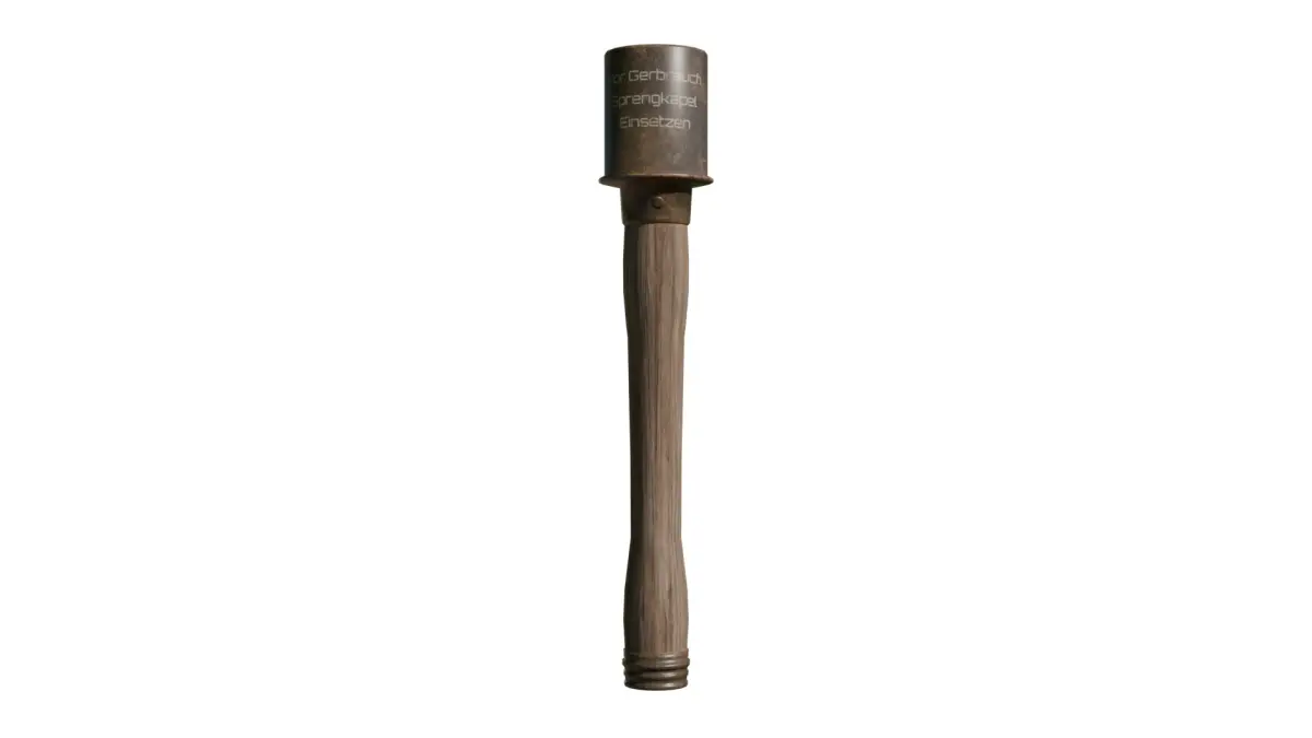 The stielhandgranate was a grenade first developed by Germany in 1915 for use in the first world war. Consisting of a tin cylinder with a hollow wooden handle. It could be thrown further than the British mills bomb, however it was less deadly as it depended on it's blast radius rather than fragmentation.