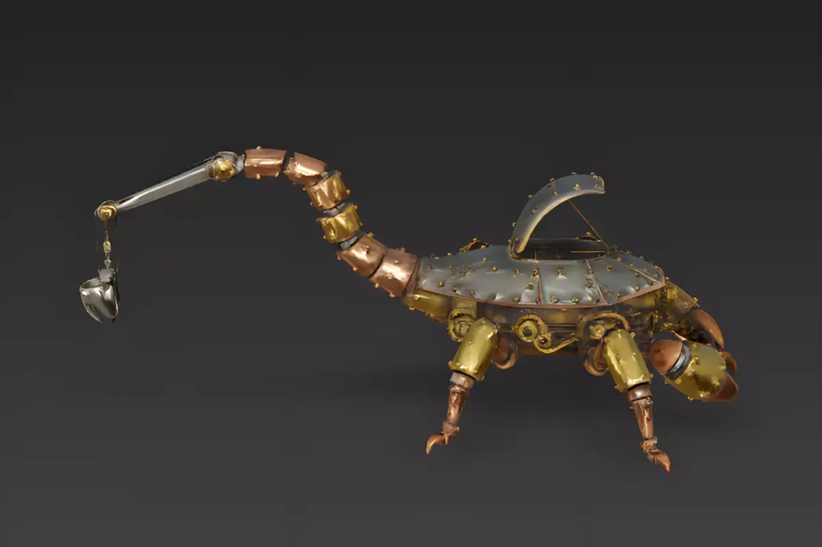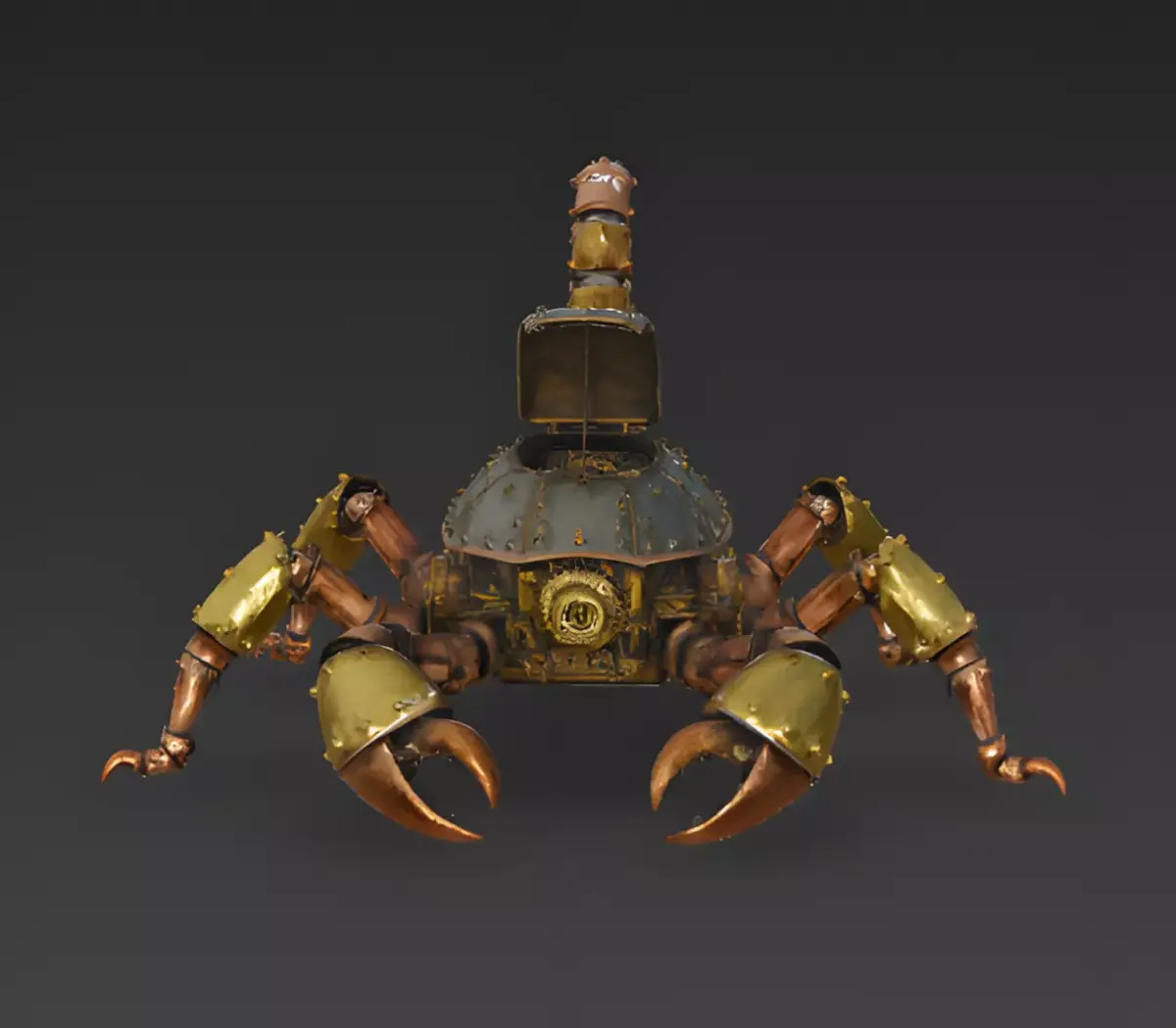 Six-Legged Walker ChassisThe scorpion moves on six robust, multi-jointed legs finished in a mix of brass and oxidized iron. Every joint is detailed with visible gears and rivets, ensuring the walker looks grounded and stable as it traverses difficult game environments.