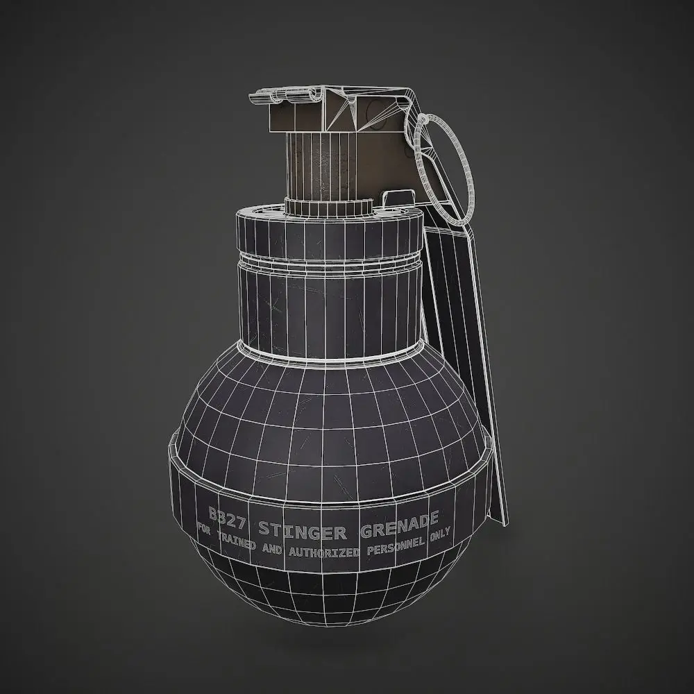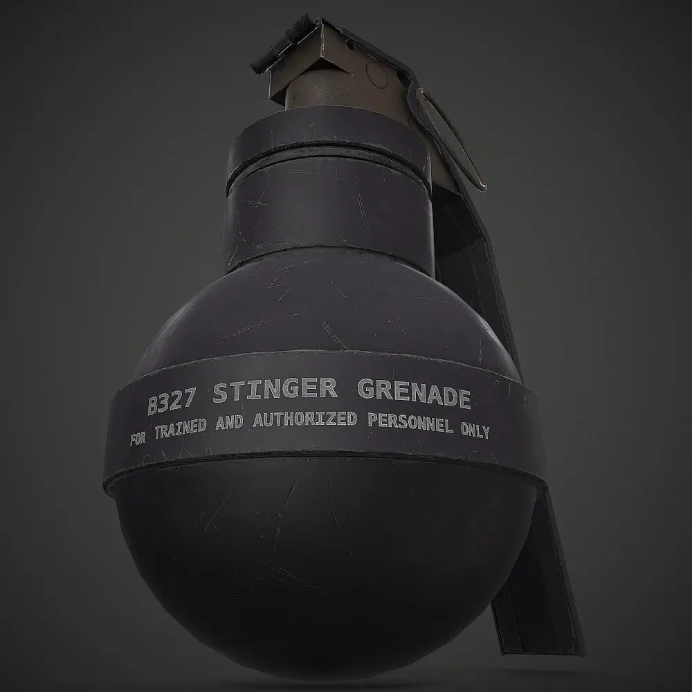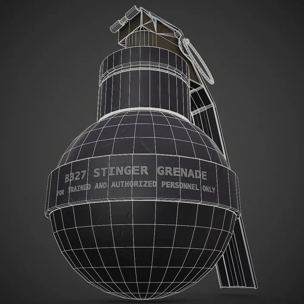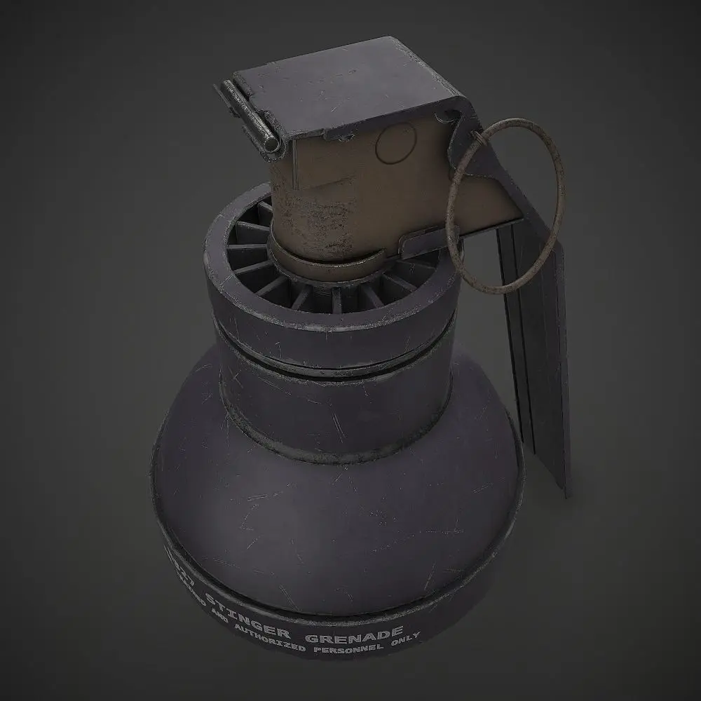 It's a Stinger Grenade! That can be used as a pick up, weapon or background clutter in a video game, or perhaps a prop in a movie. It's been given a bit of wear and tear to help it fit into more dusty/dirty environments.
