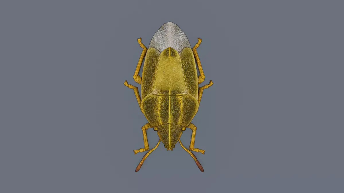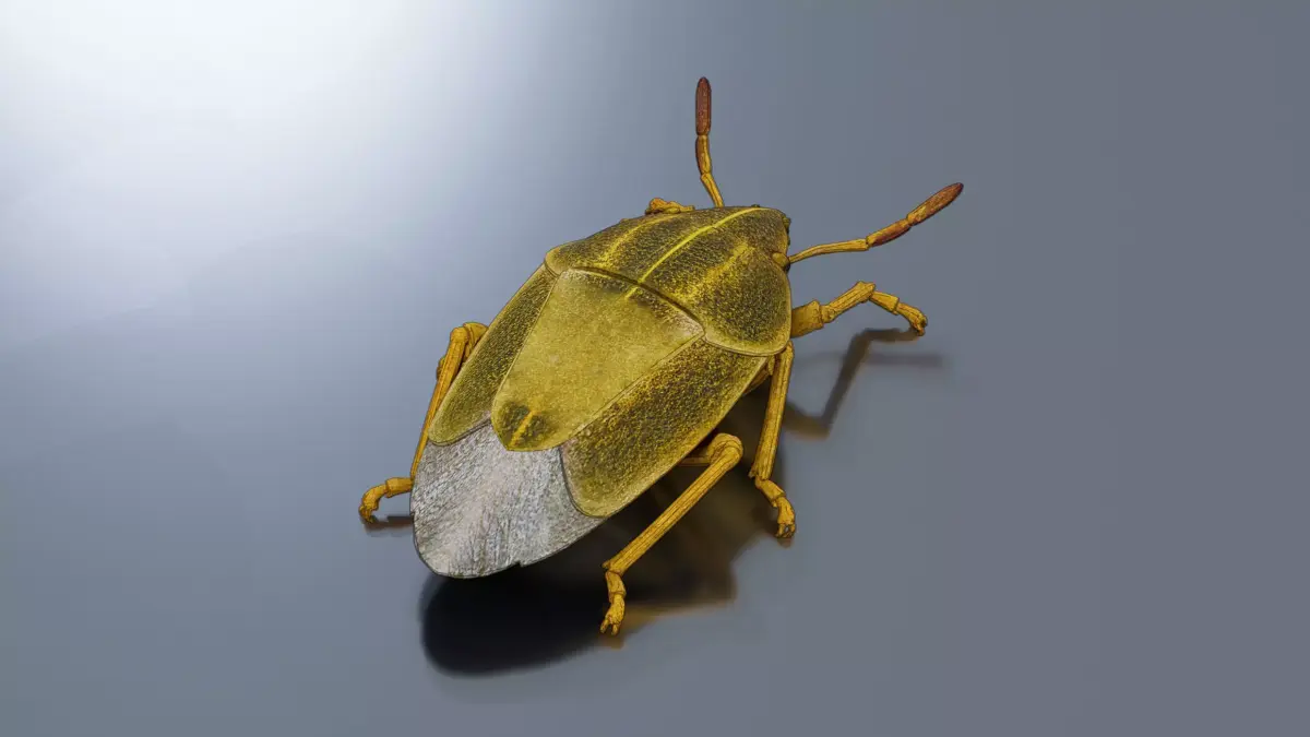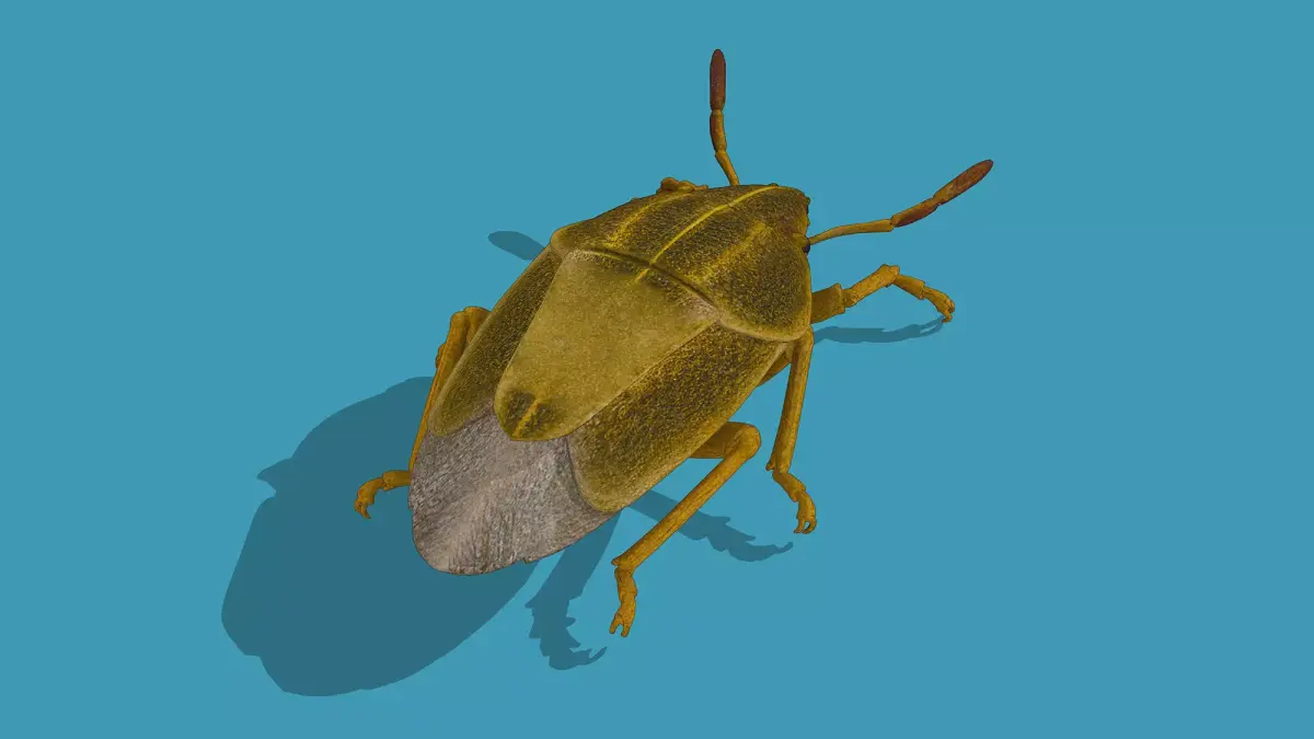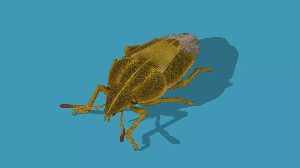This 3D low-poly model of a stink bug captures the essence of the insect with a minimalist, geometric design. Crafted with a limited polygon count, the model features a blocky yet recognizable representation of the stink bug's shield-shaped body, segmented legs, and elongated antennae. The muted yellowish-green coloration, accented with darker brown tips on the legs and antennae, adds a touch of realism to the stylized form. The model is set against a solid cyan background, with a soft shadow that enhances its three-dimensional appearance, making it an ideal asset for games, animations, or educational visualizations.