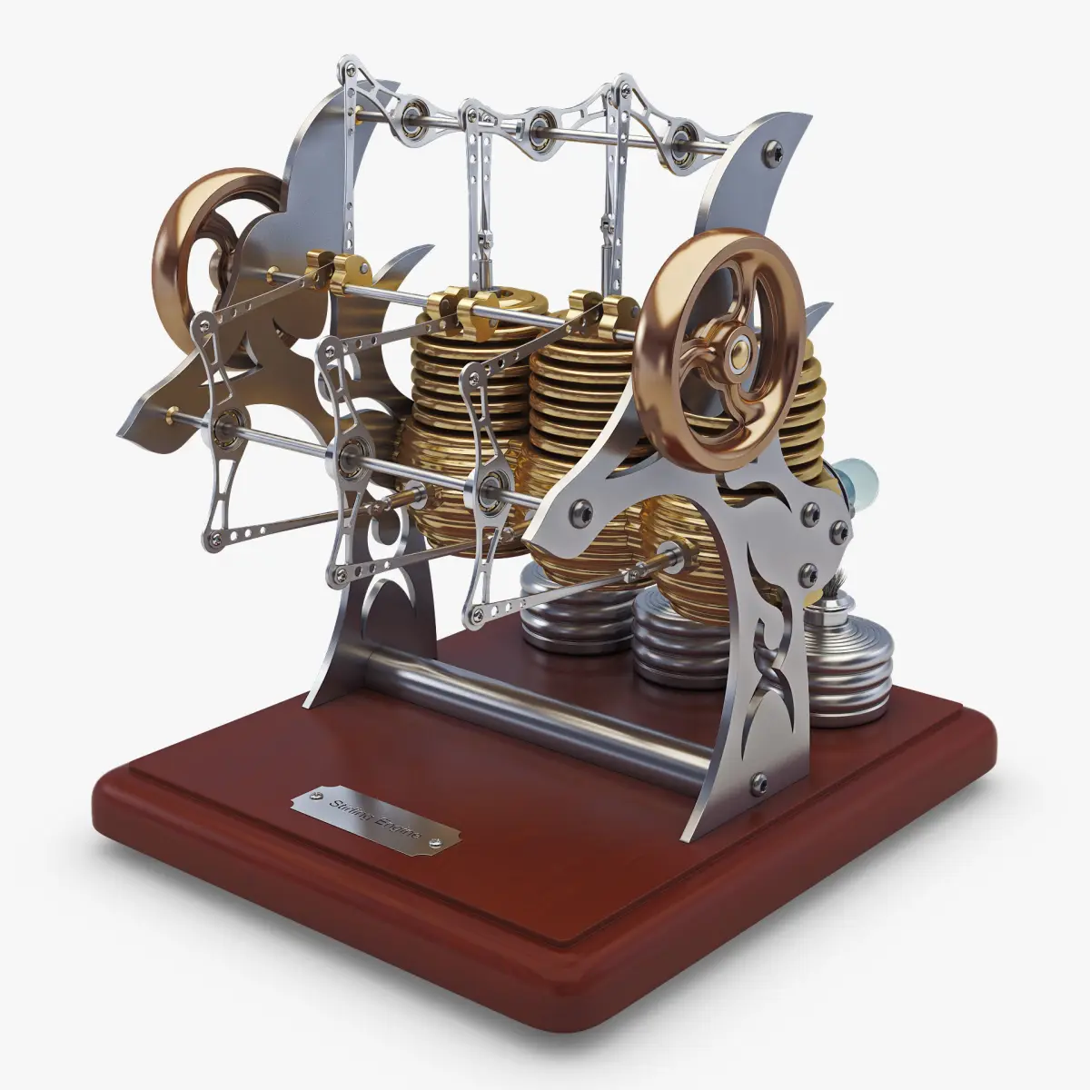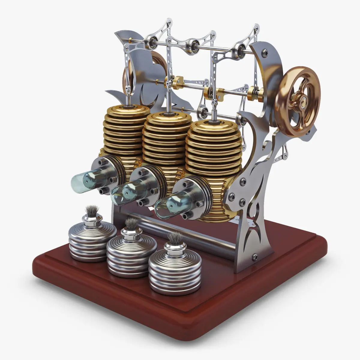 3D Model name: Stirling Engine Triple v 1This 3D Model can be use in different projects, for example: high-quality renders, illustrations, video clips, videos or film industry, etc. The 3D model was made by polygonal method, the details were carefully worked out. Materials included in the 3D model. Does not need for cleaning, just add the model to scene and start rendering.