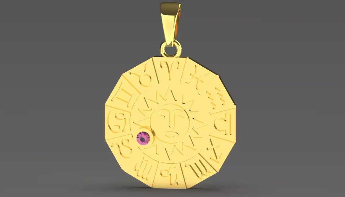 The pendant is a striking piece in the shape of a circular zodiac wheel intricately designed in polished gold. It consists of twelve segments, each marked with zodiac symbols, showcasing meticulous craftsmanship. The symbols are carved, creating an open design that gives the pendant depth and complexity.