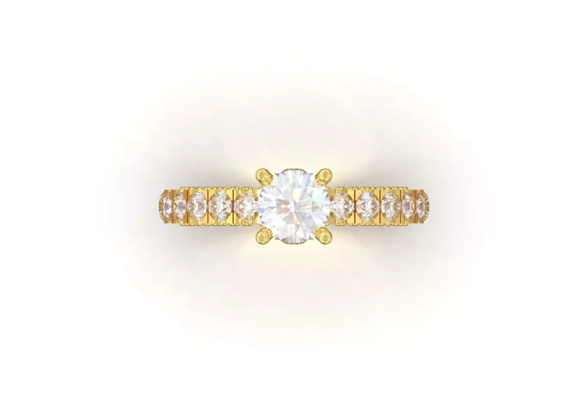 Technical Design and DetailsSolitaire Center Stone: A large, round diamond (Round Brilliant Cut) is set in a classic prong setting with six or four long prongs at the center. This type of setting allows maximum light to enter the stone.