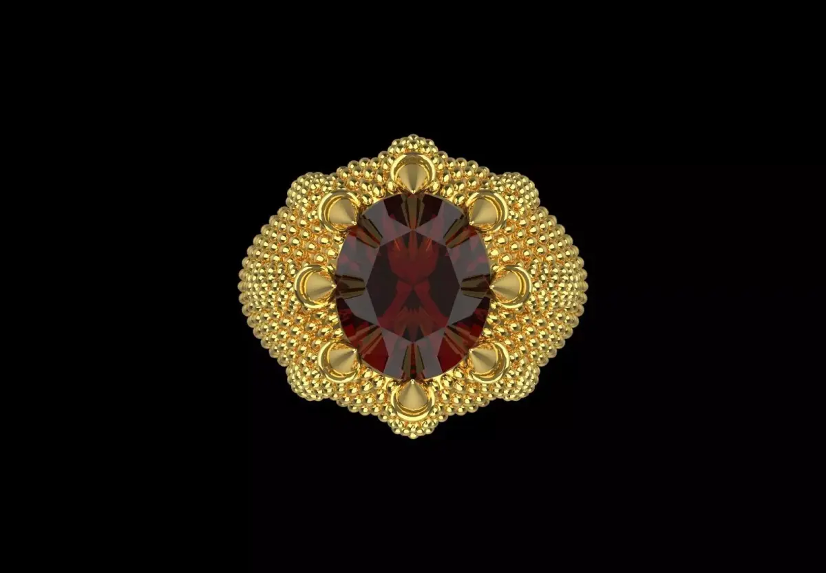 - Large Gemstone: In the center of the ring, a large round-cut gemstone is placed. The color of the stone appears to be red or dark brown.