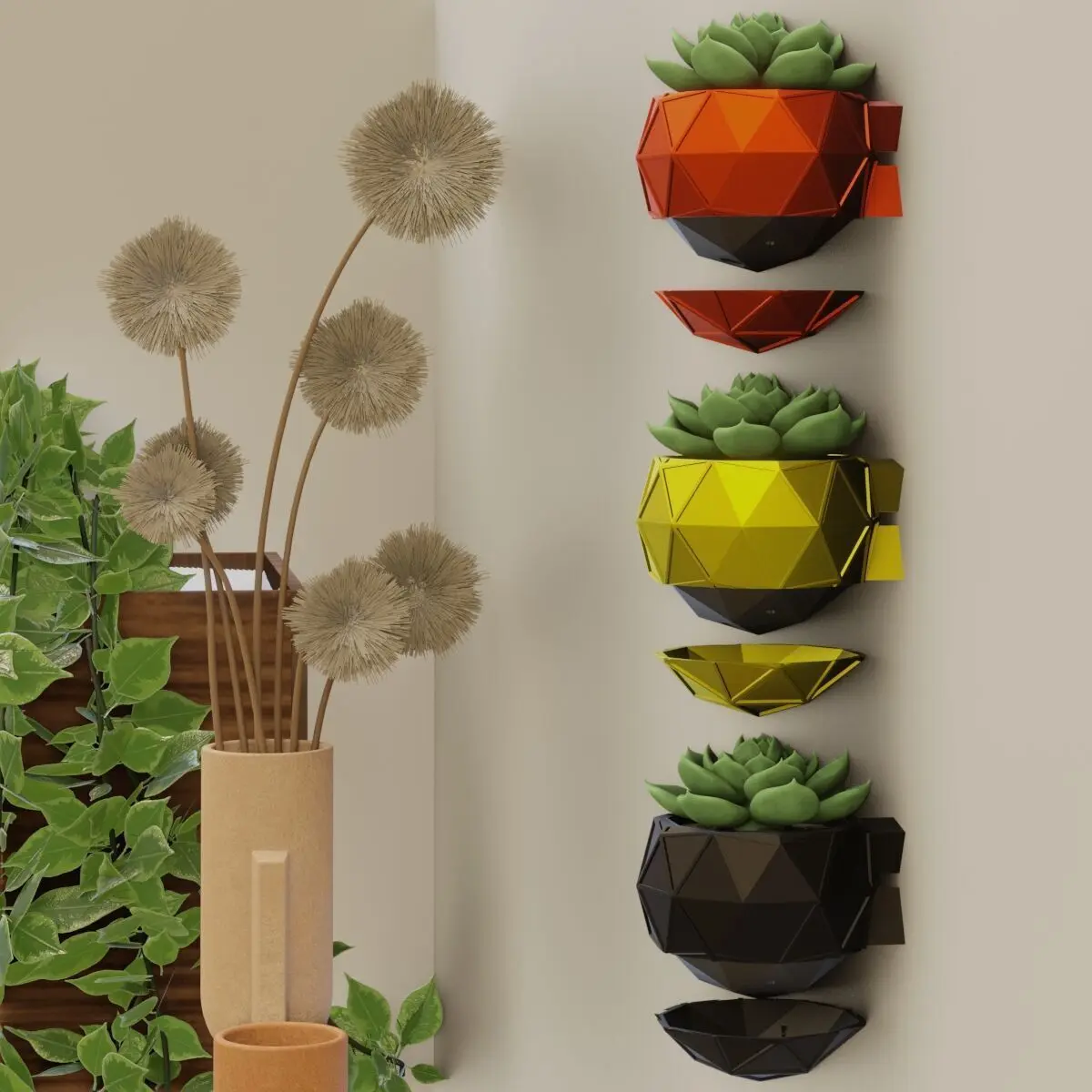 Small icosphere planters,one in the form of a wall planter and the other a desk version,both included in this buy.Both have been designed with a beautiful geometric form,drainage holes and with a lock on integrated drip tray.