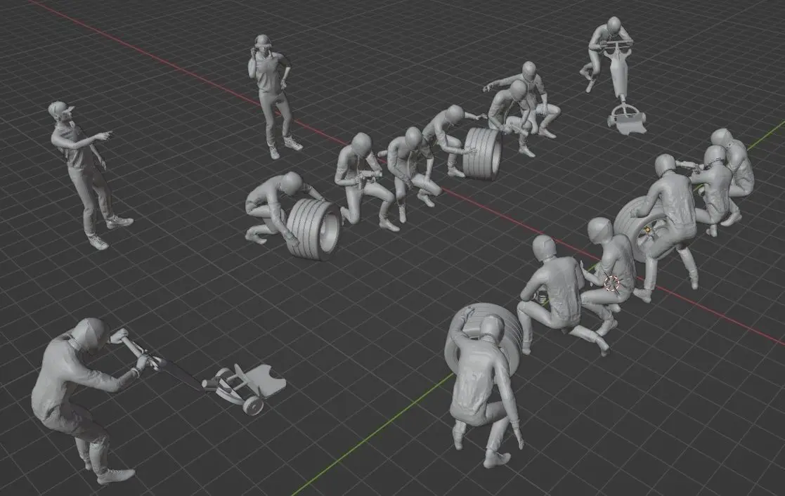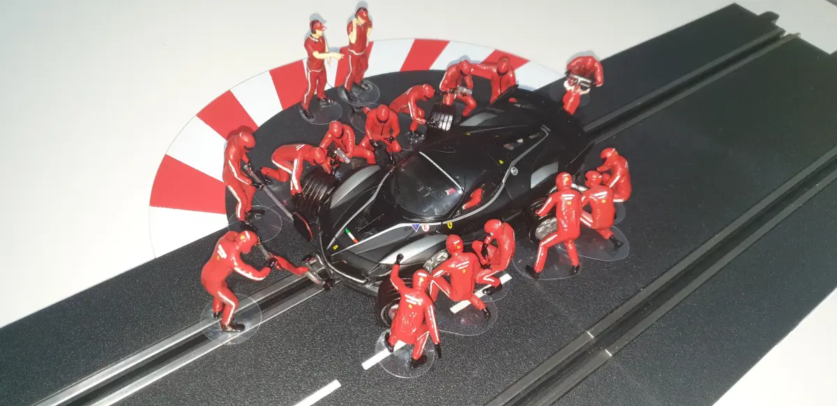 I have designed this Pit Crew for my Carrera Digital 132 Track. I made it look like a Formula 1 crew during a pit stop. There are 17 different figures. Ideal for any slot car track in scale 1/32, including Scalextric. Also easy to resize for other scales. Print it with resin printers for the best results.