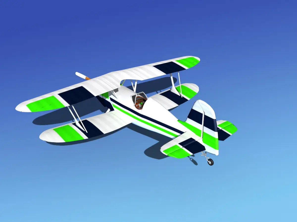 Starduster is built very near to scale, within a few inches of actual general dimensions and fully textured. It includes a detailed cockpit with instrumentation and controls. The instrumentation and controls for the single cockpit are modeled and textured. It has animateable ailerons, elevators, rudder, propeller, and landing gear spring and roll. This model comes in 11 different formats.