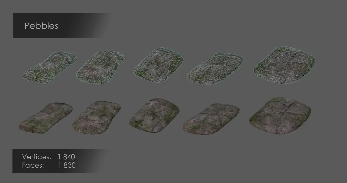Stones assets: 3 stones, 5 pebbles, stone arch, idol;