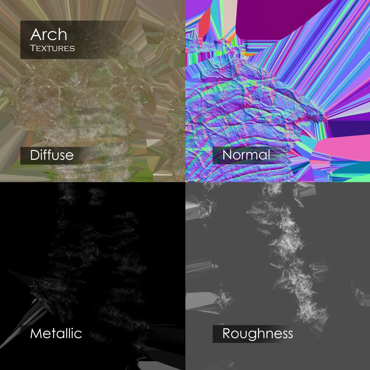 StoneArchAll Objects_Cycles: Scene with seted up objects with materials and textures without atmospheric lightning, fog and background effects.