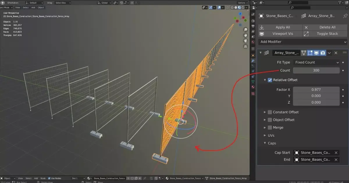 Here is an array modifier-based construction fence with stone bases.