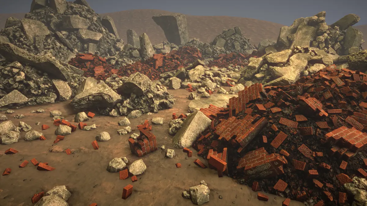 Here you can find a lot of stone and brick debris heaps and separated broken parts.