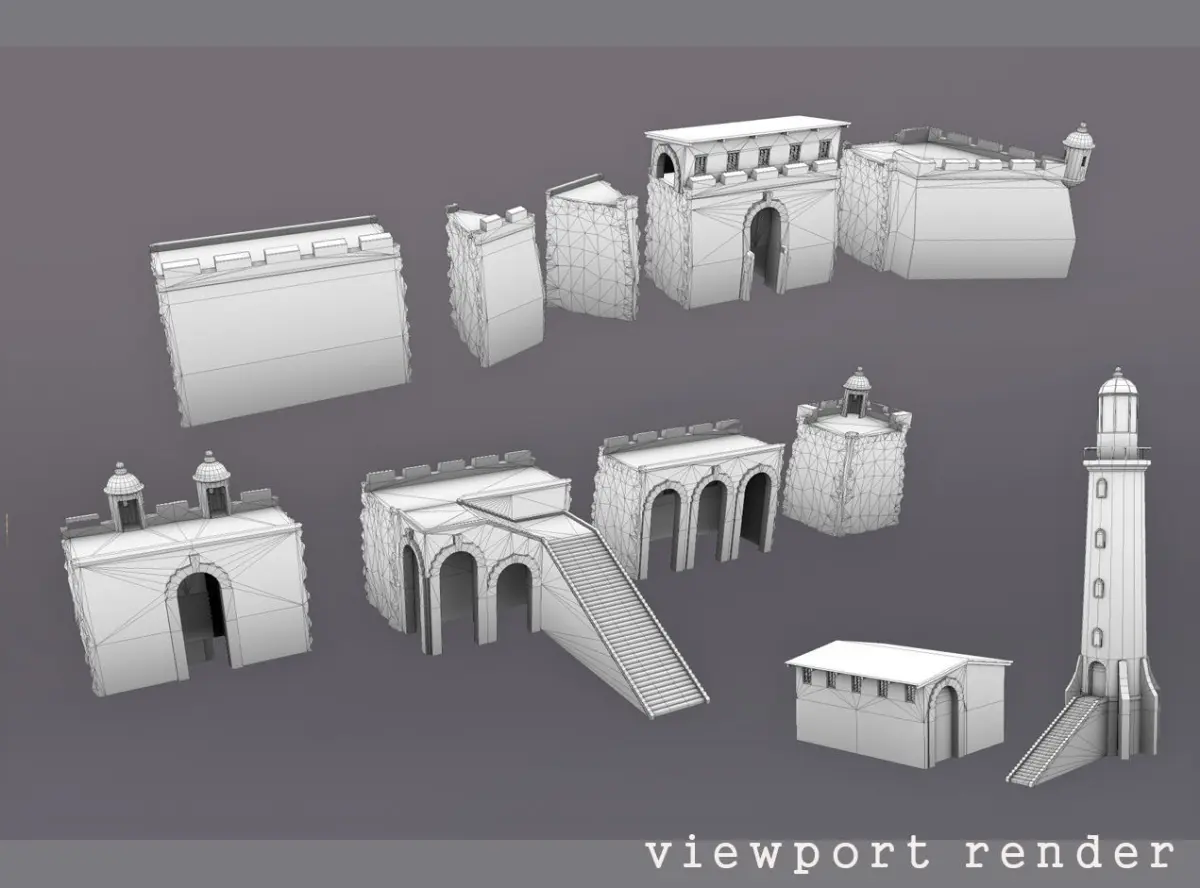 01.Main Gate + Bridge 02.Wall 03.Wall with Laddder 04.Back Gate + Shed 05.Bastion 06.Bastion with Tower 07.Wall with Gallery 08.Wall angle (90 deg.) + Tower 09.Stones for destruction 10.Wall angle (45 deg.) Interior 11.Wall angle (45 deg.) External 12.Stable 13.Lighthouse