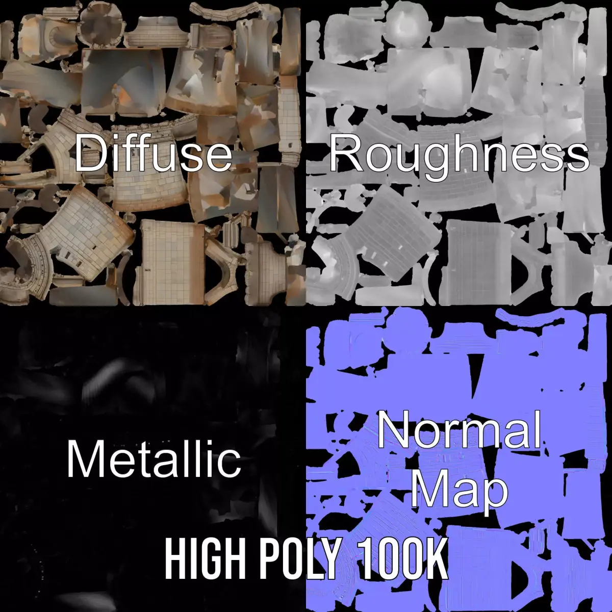 This detailed Stone Fortress Tower model pack is perfect for historical games, architectural visualizations, and film production, showcasing a sturdy castle design. Each model has 3 levels of detail: low-poly (1000 triangles for mobile), middle-poly (10,000 triangles for environment), and high-poly (100,000 triangles), which allows for the use of this model in production rendering (such as 3ds Max, Maya, Cinema4D, Blender, Vray/Corona/Cycles and all others), game engines (Unity and Unreal compatible), and interactive presentations, providing a choice of detail based on the LOD System principle. The PBR textures, including Diffuse, Normal Map, and reflection/roughness/metallic, ensure compatibility with modern rendering engines. All models are accurately unwrapped with no overlapping UVs. Textures are 4096*4096 in size. Like and leave a comment if you enjoyed this model pack!