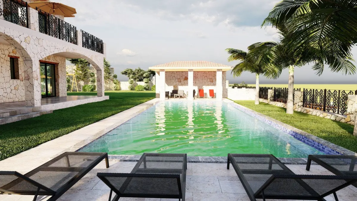 It is a wonderful stone villa design in a large area, the size of a mansion, with a very large swimming pool and large garden and hobby areas.