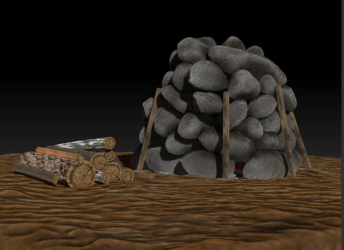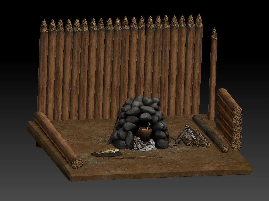 The asset includes a stone stove scene with a pot of porridge,bone, fish, flat stone and wooden objects - firewood, fireplace, coals, charred branches, wooden walls, stake and palisade.The total size of all objects in the scene - vertices: 286 533; faces: 572 994Format - ZTL, BLENDER, FBXThe normal map was baked from a high poly model 2k, texture map -2k File name - Scene_Stone_Bake* format - ztl,fbx,blender