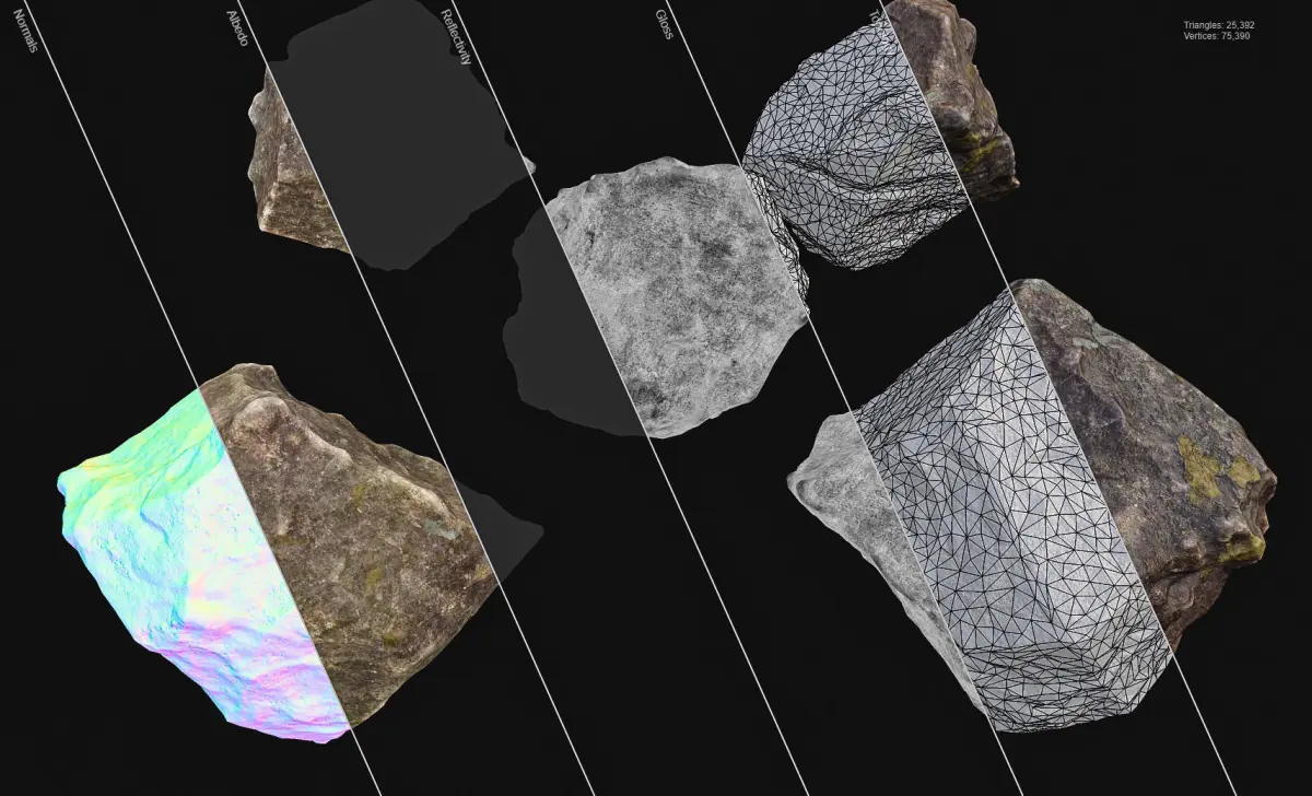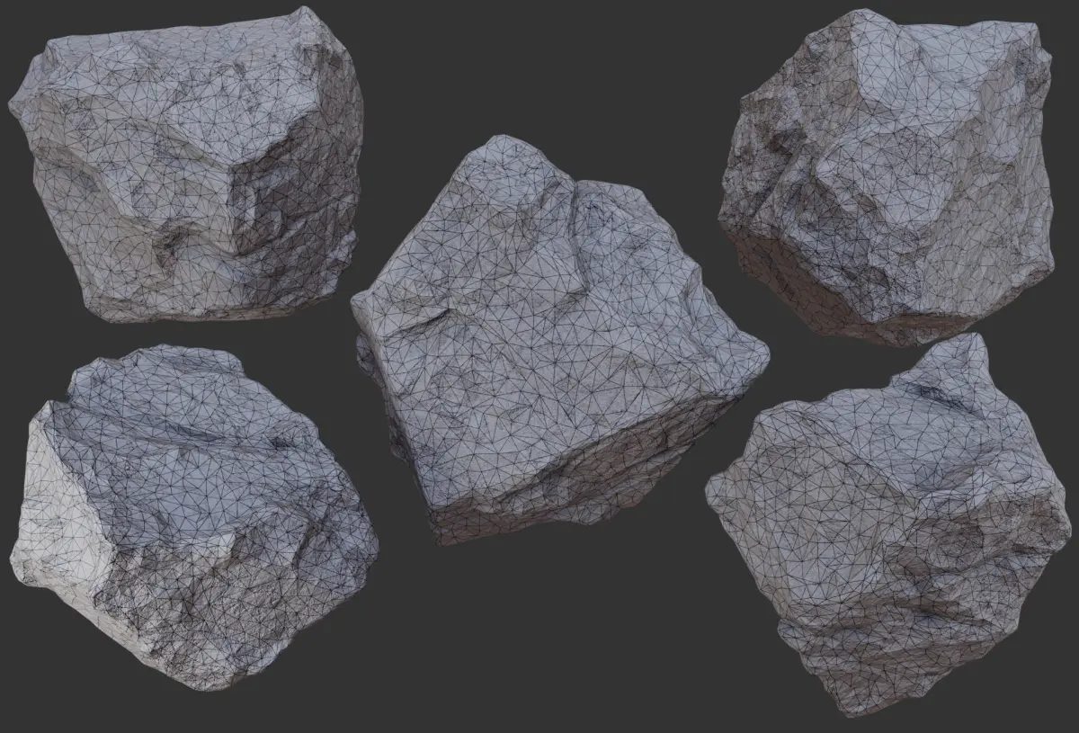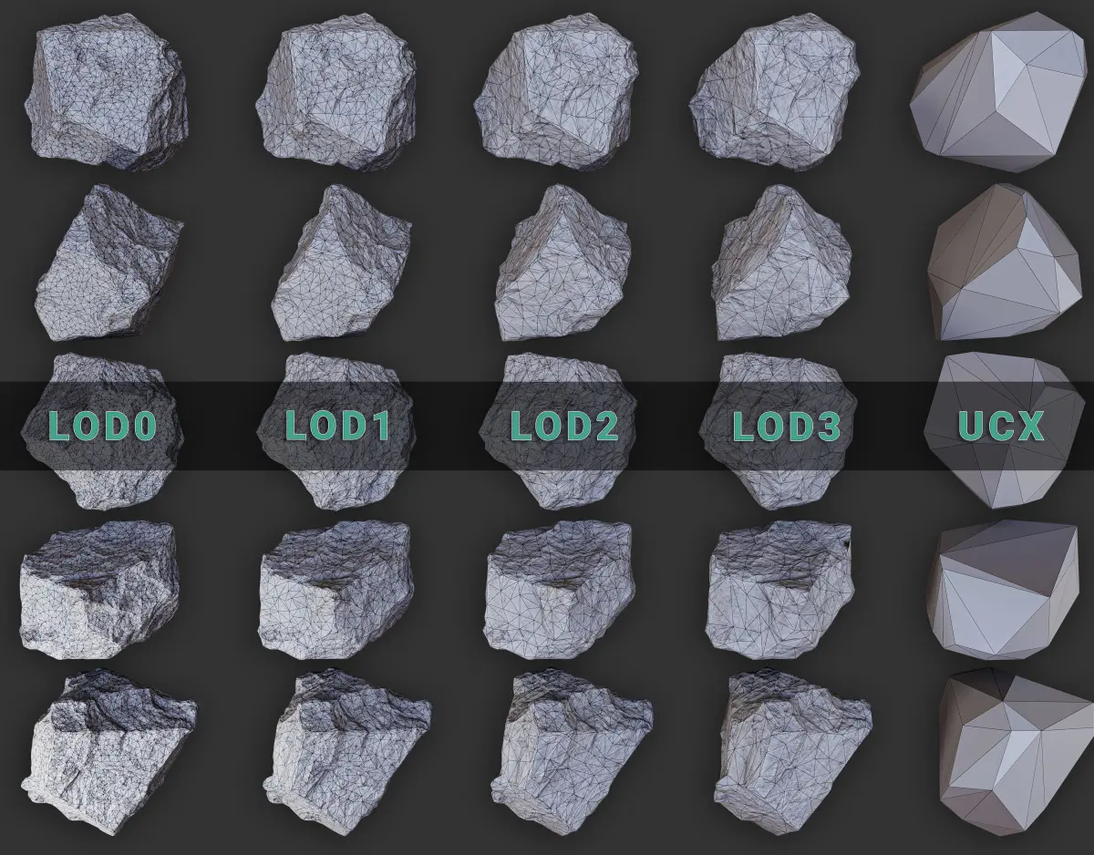The model comes with a full set of 4K textures. There are 5 stones in the set. Each has 4 LOD groups (level of detail) and a collision object.