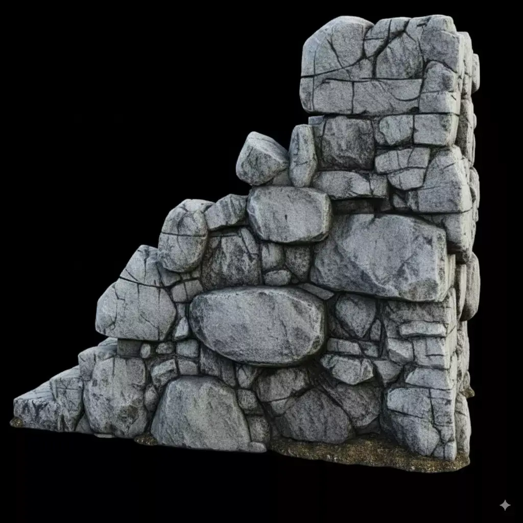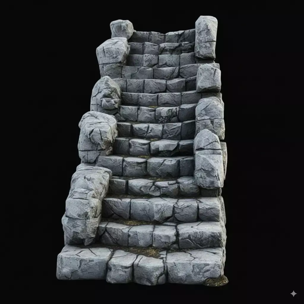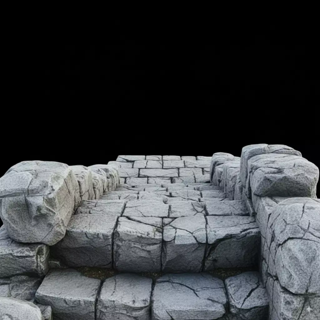 Download the highly detailed 3D model of a stone staircase, a realistic digital recreation of an ancient, rugged rock stairway built from irregularly shaped gray stones. This stone steps 3D model features weathered surfaces, moss patches, cracked joints, and natural erosion patterns that evoke the feel of a forgotten ruin or fantasy fortress. The structure is composed of wide, uneven steps flanked by rough stone walls and large boulders, creating a sense of age, strength, and mystery. Ideal for use in game development, film production, architectural visualization, NFT art, concept design, and digital storytelling, this rock staircase 3D asset brings authenticity and dramatic scale to any environment.