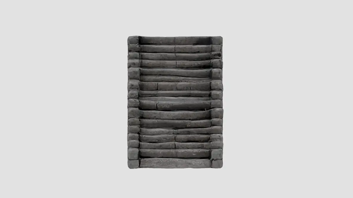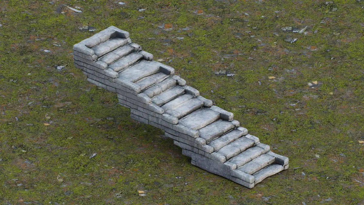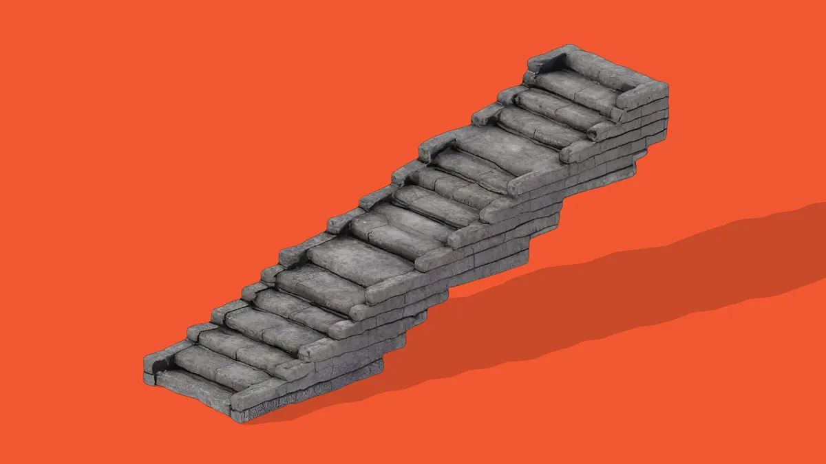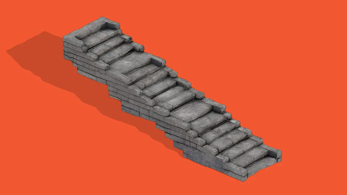 This 3D low-poly model depicts a rugged stone staircase, designed with a minimalist yet detailed approach. Crafted for use in video games, architectural visualizations, or educational projects, the model features a textured stone surface with a weathered appearance, giving it an authentic, ancient feel. The staircase ascends diagonally against a vibrant orange background, casting a subtle shadow that enhances its three-dimensionality. Its low-poly design ensures efficient rendering while maintaining visual appeal, making it a versatile asset for various digital environments.