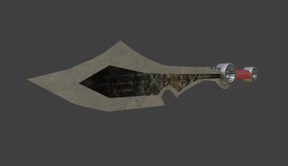 A stone sword made from a tombstone, with a leather handle
