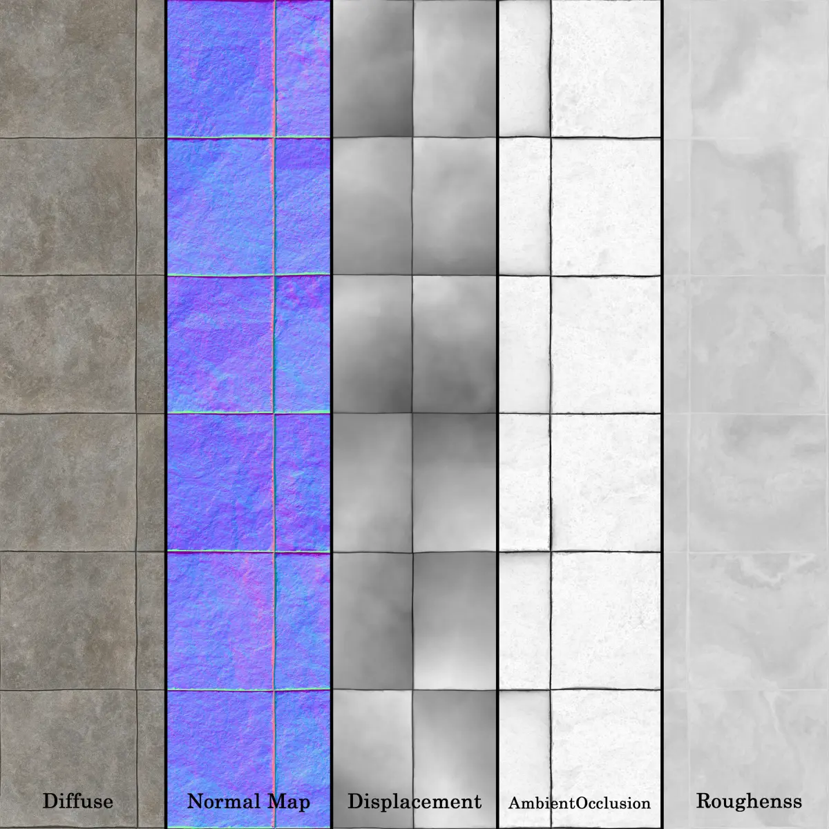 Base color PNG 8 bitNormal Map PNG 8 bitRoughness PNG 8 bitAmbient occlusion PNG 8 bitDisplacement PNG 16 bit