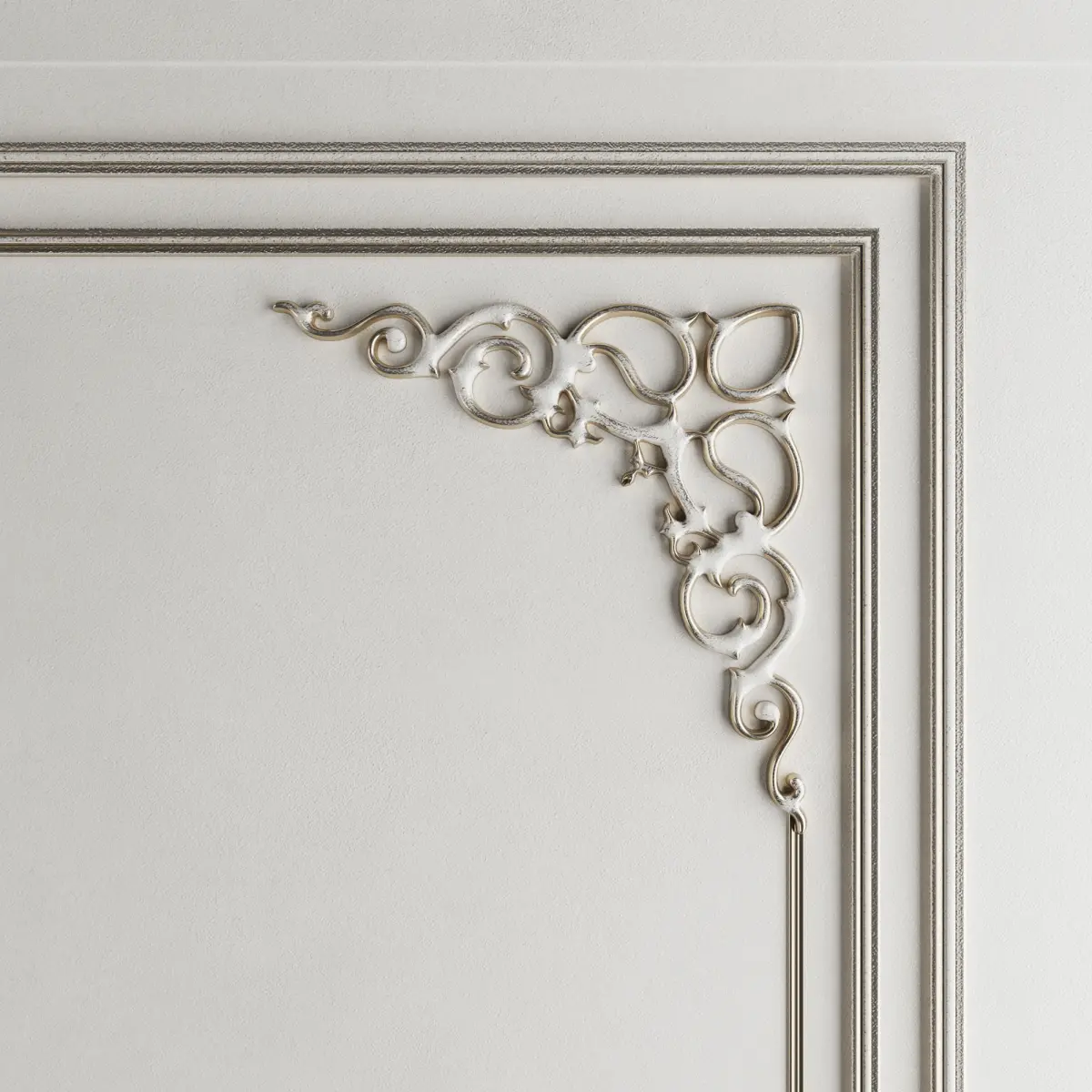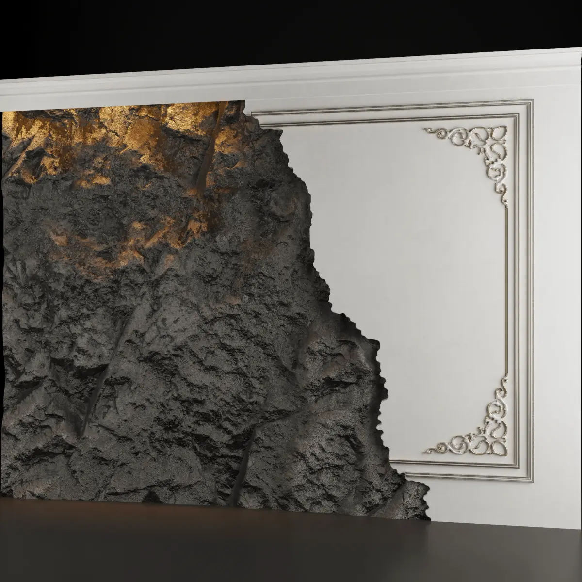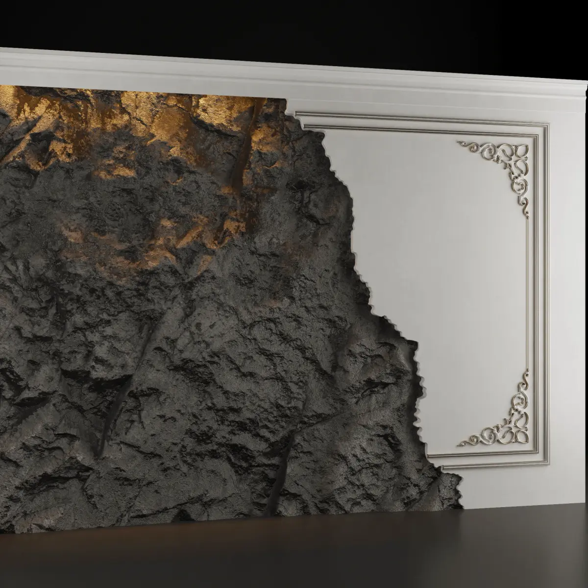 Каменная стена, переходящая в ровную стену с лепниной, которая покрыта патиной. Прекрасно впишется в разные интерьеры: от лофта до современной класски.