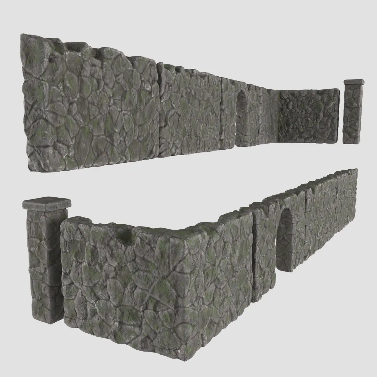Modular wall. Consists of five parts from which you can make a fence. Textures have logical names (4096*4096, png format). Objects are grouped. Lighting and scene settings not included.
