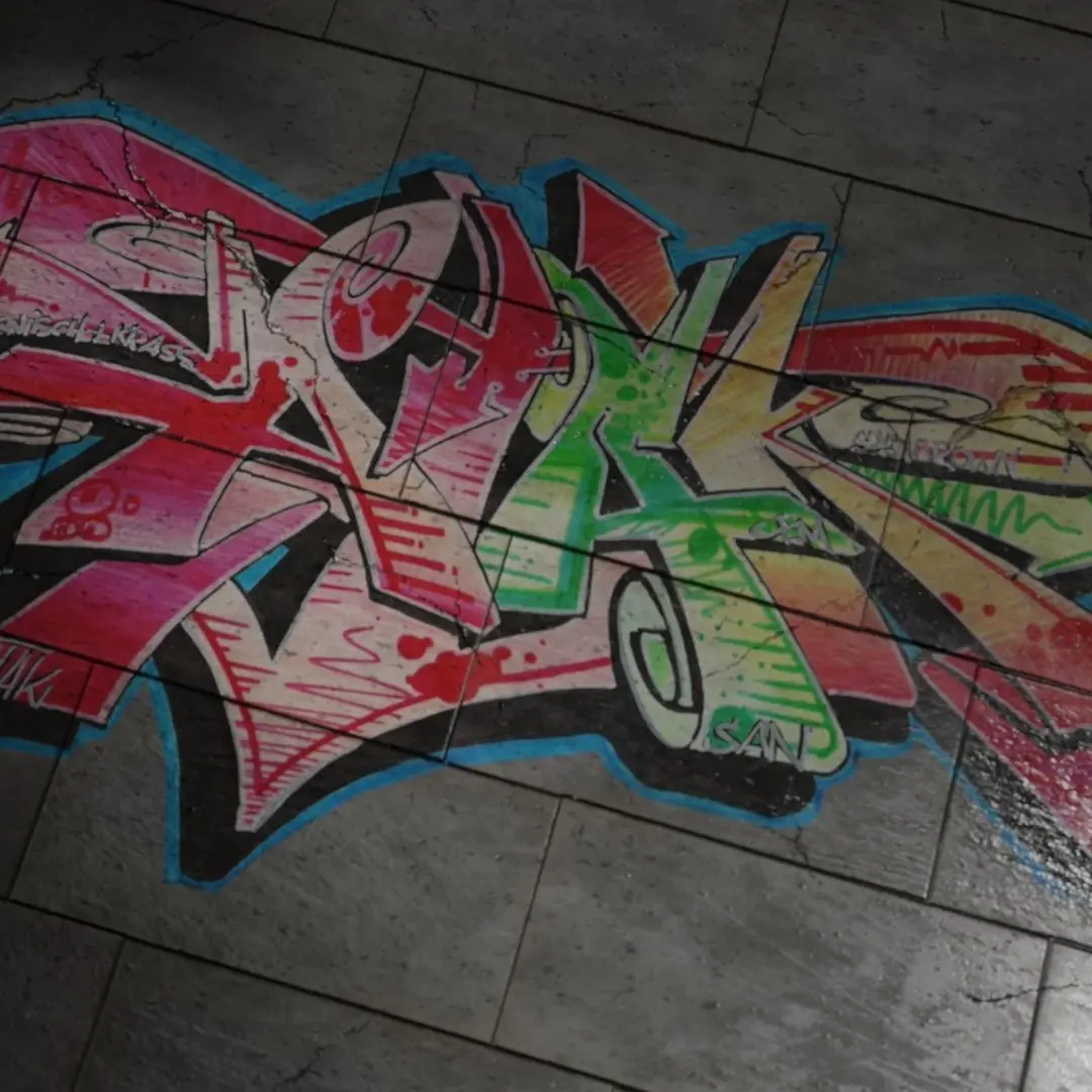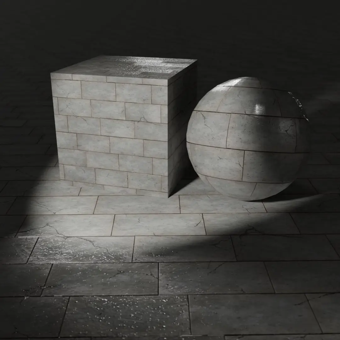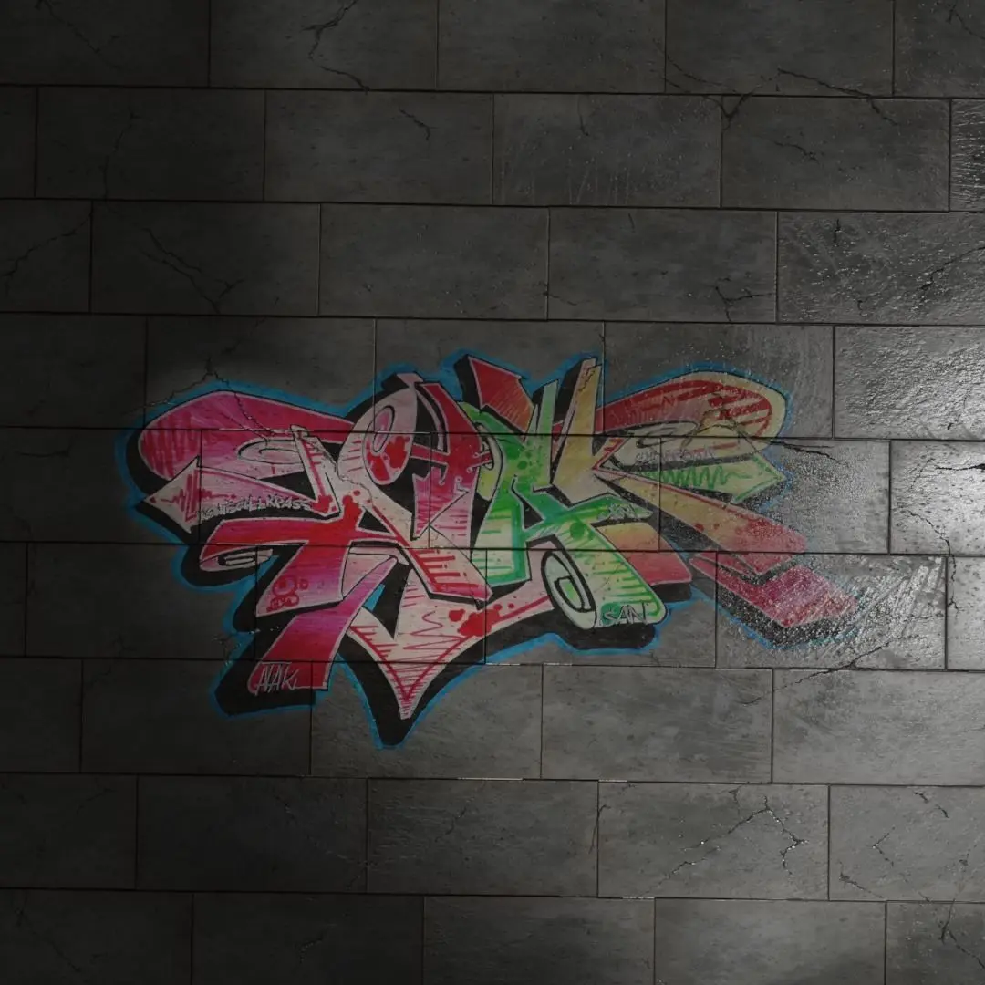 Seamless worn & cracked Stone Wall with Graffiti PBR texture (4K & 2K). Created in Abobe Substance, object preview rendered in Blender Cycles.