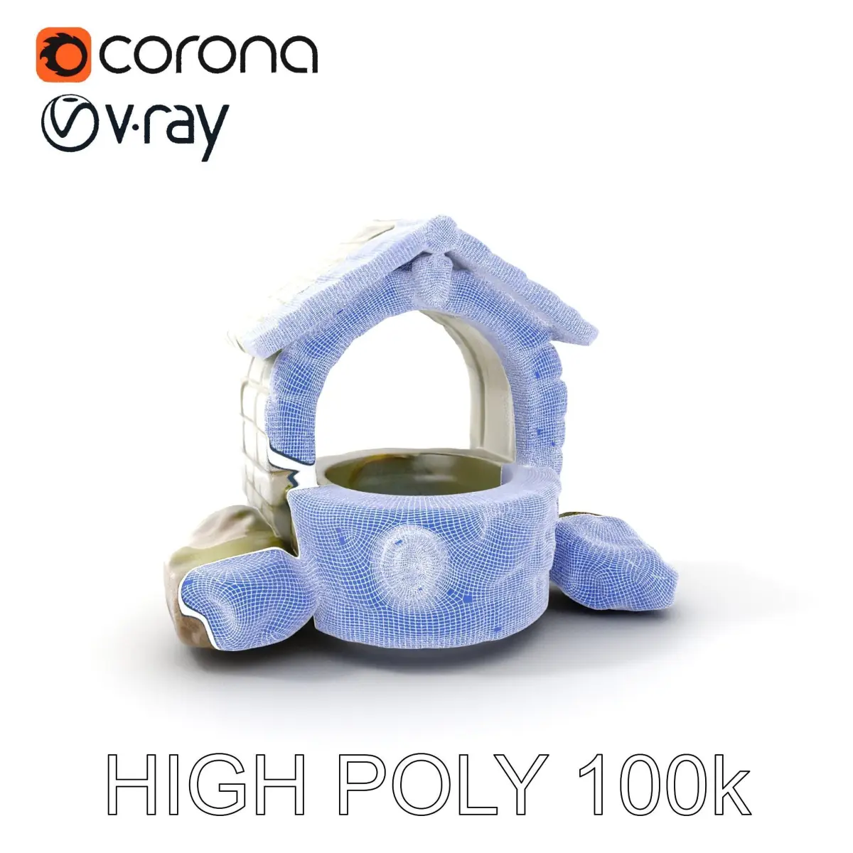 This versatile Stone Wishing Well 3D model pack features three levels of detail: low-poly with 1000 triangles ideal for mobile, mid-poly with 10,000 triangles suitable for environments, and high-poly with 100,000 triangles perfect for production rendering.