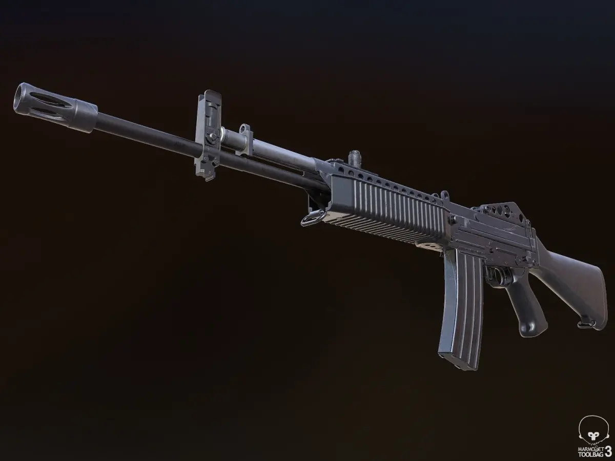 - The weapon is separated into objects to make animation easier. Movable parts include charging handle, bolt carrier, magazine, magazine release, fire selector, and trigger.