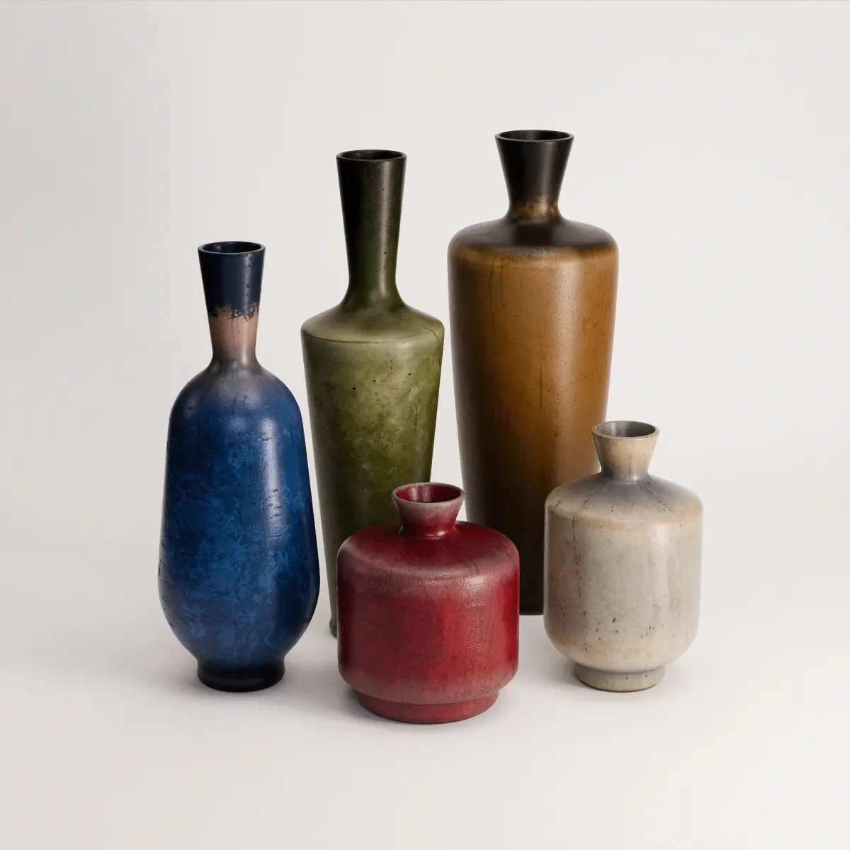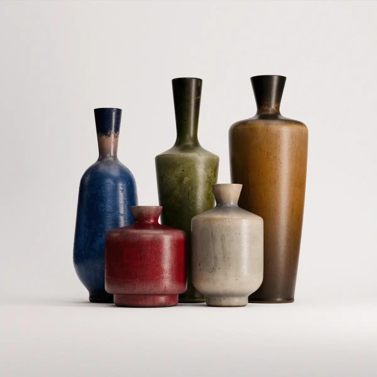 The Stoneware Vases Set 01 presents a beautifully curated collection of five distinct ceramic vases, each with unique shapes, rich textures, and an earthy, weathered patina. Featuring a diverse palette of deep reds, blues, greens, and neutrals, this set blends rustic charm with timeless elegance, making it perfect for interior design visualizations, still-life compositions, and high-end décor renders. Crafted with high-resolution PBR textures, each vase captures the subtle imperfections of aged stoneware, from surface wear to color variations, ensuring maximum realism. Whether used as standalone pieces or as part of a larger scene, this set brings warmth and authenticity to any 3D project.