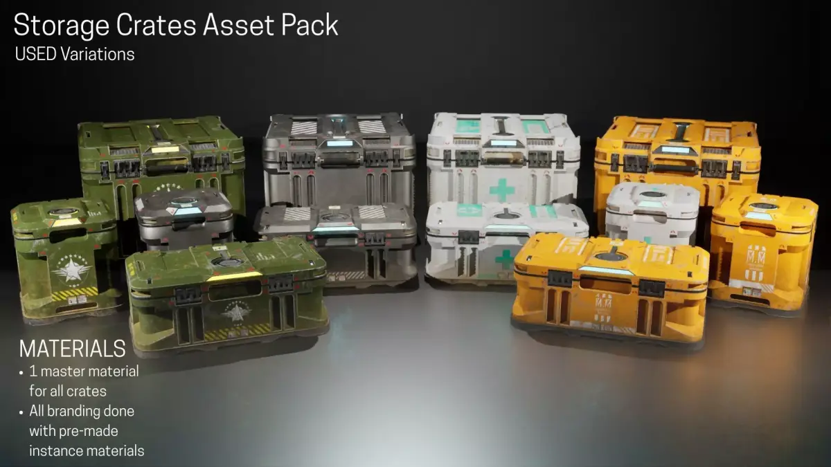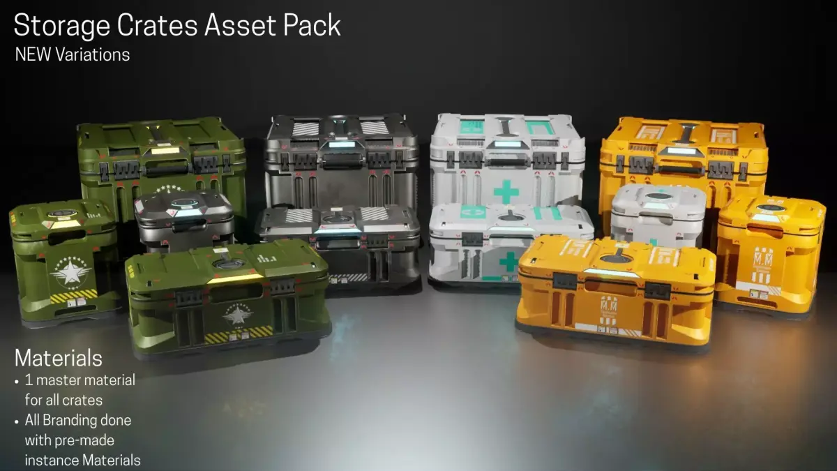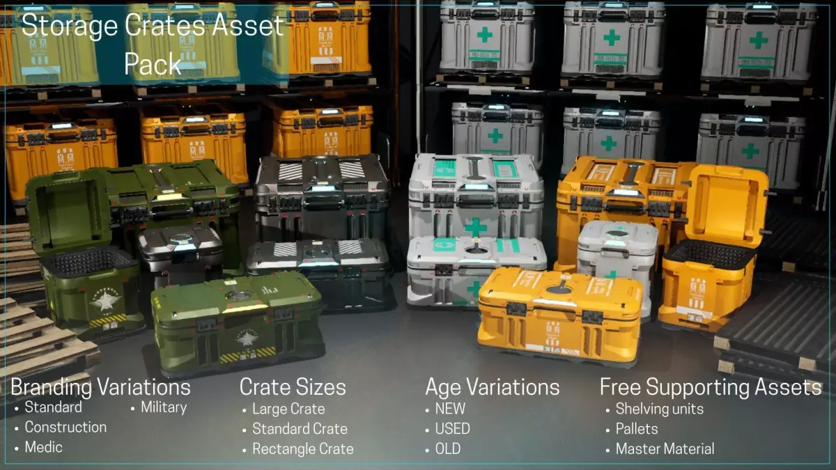 What’s Included3 high-quality crate models: Large Crate, Standard Crate, Rectangular Crate4 branding variations: Standard, Construction, Medic, Military3 age states: New, Used, Old36 unique crate variations in totalAdvanced Master Material