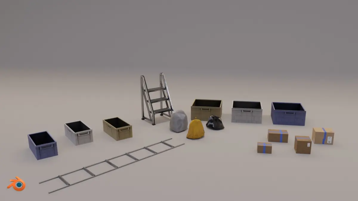 Different options of shelves with various contents.Various options of cardboard boxes.Plastic bags.Plastic boxes.Pallets.Ladders.