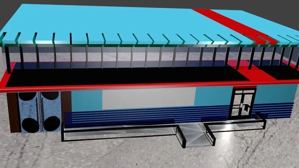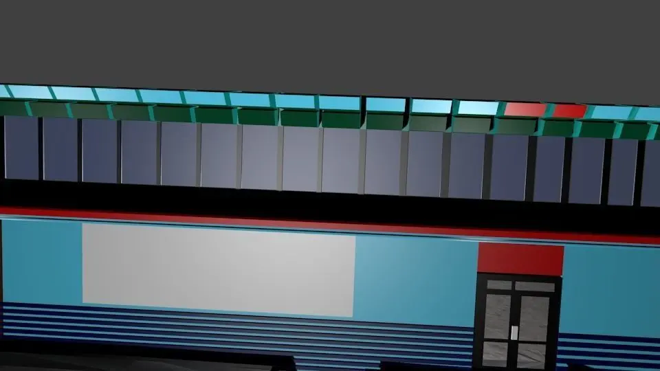 A simple design that suits all kinds of stores and is an excellent model.The store has two doors made of glass and plywood with some metal. It has excellent awning and sides with realistic textures. There is a modern railing in the front.