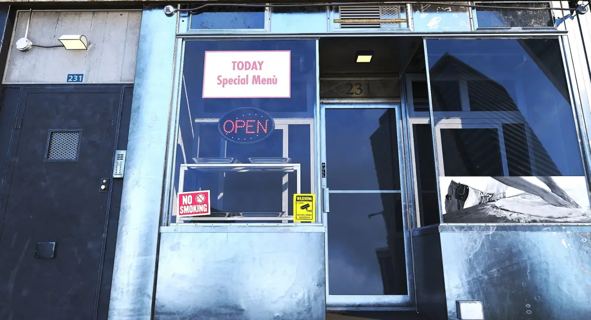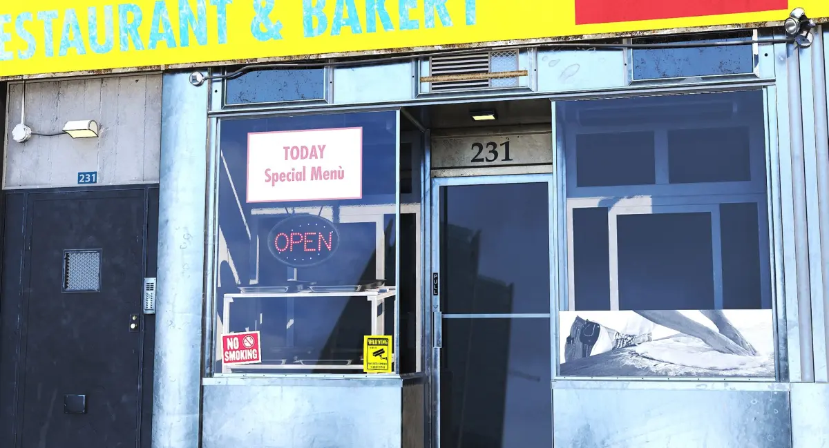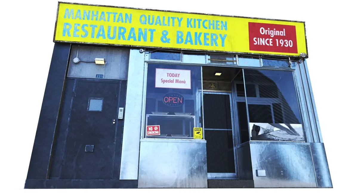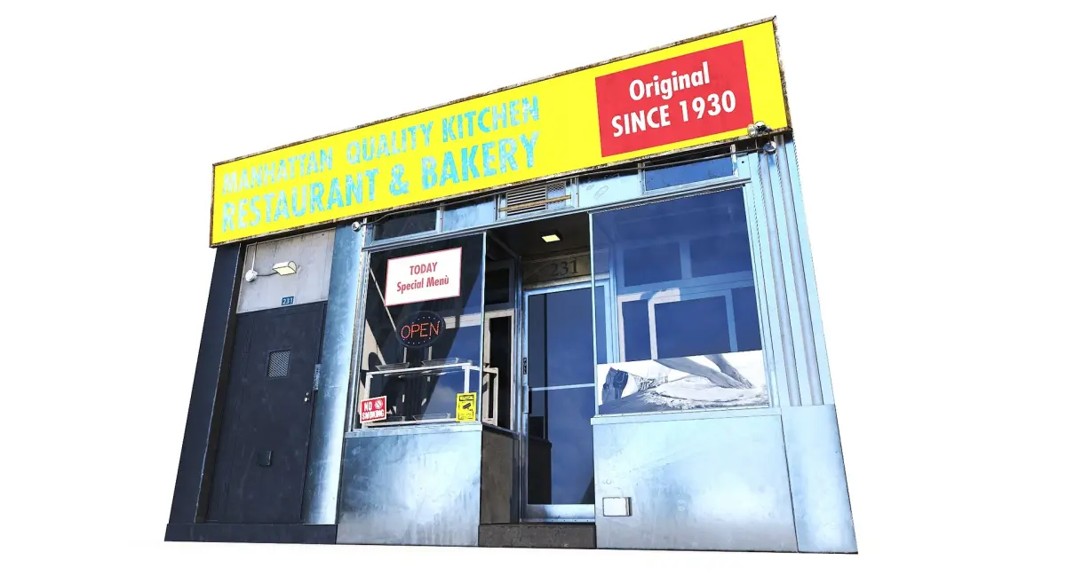 Realistic New York–style brick storefront inspired by early 20th-century bakery and restaurant facades. Detailed PBR materials, clean UVs and optimized geometry for cinematic and real-time environments.