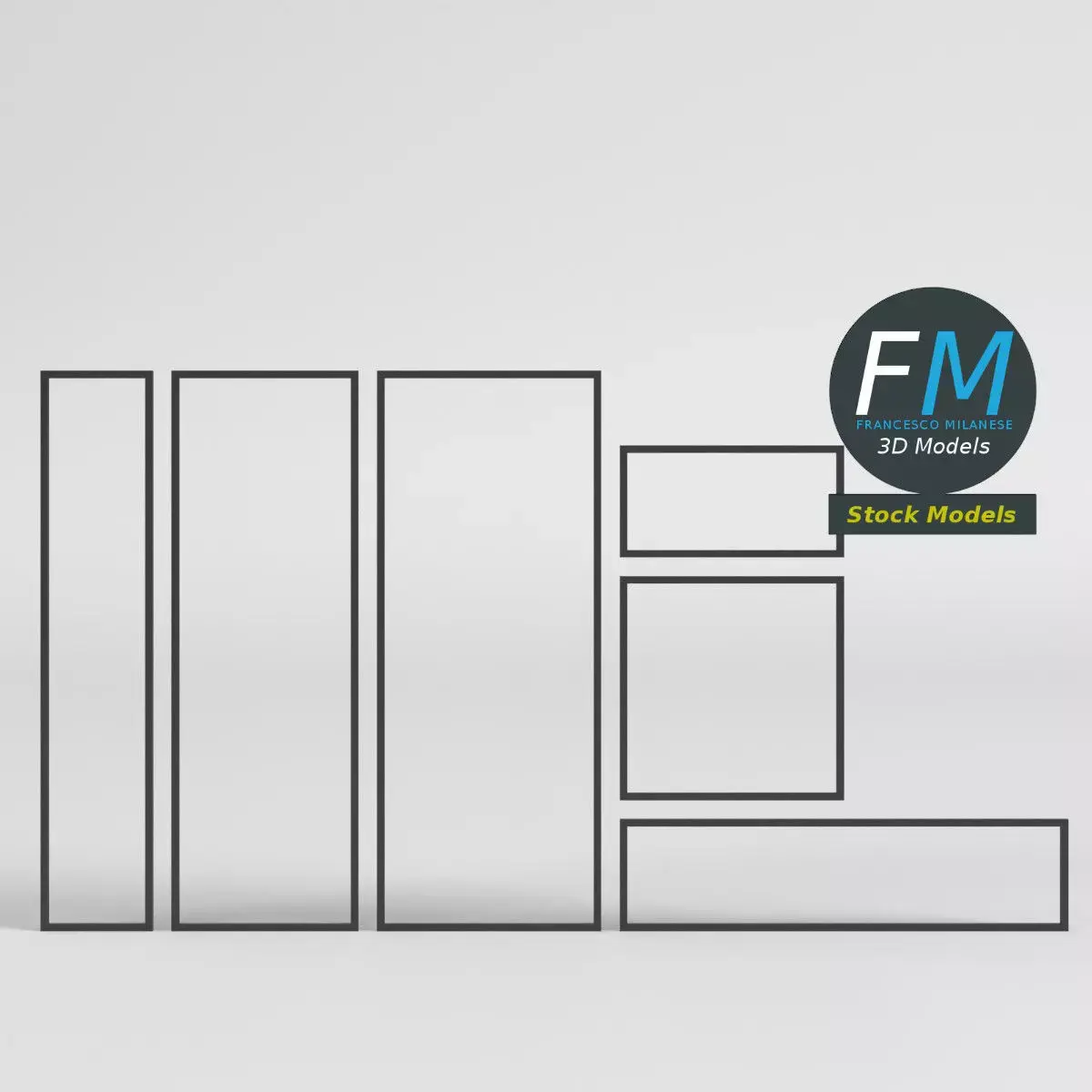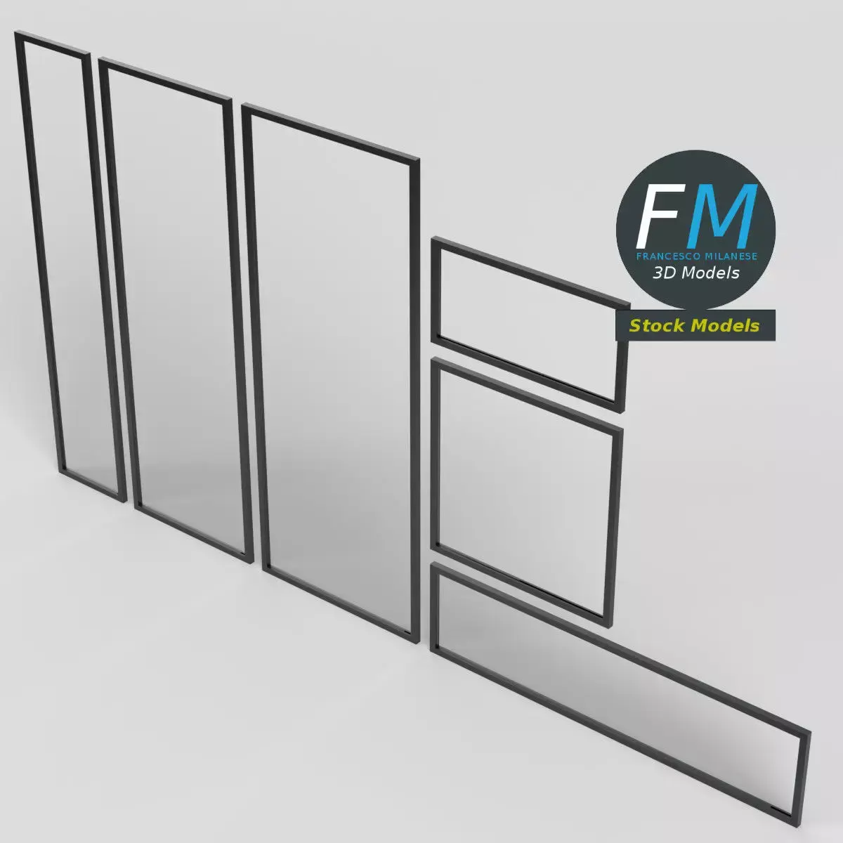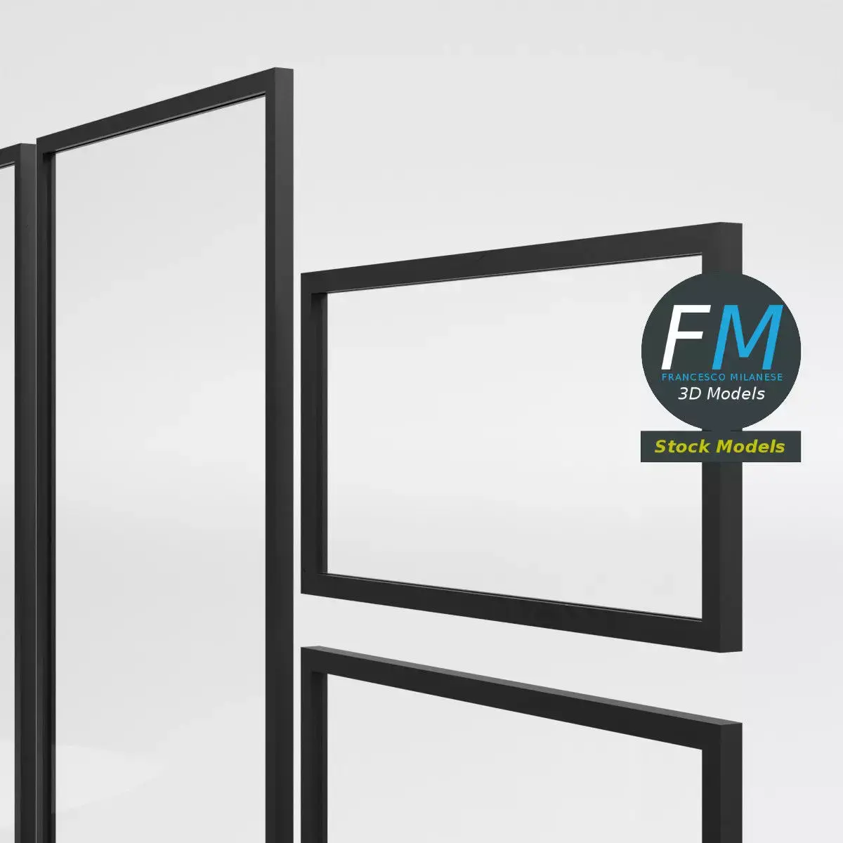 A modular set of minimalist storefront window frames 3D Models featuring tall vertical panels, a mid-sized rectangular transom, square, and a wide horizontal transom unit, designed for flexible architectural layouts in modern commercial environments. 6 low poly objects (narrow, square, standard, transom 1, transom 2, square), sharing the same non overlapping UV Layout map, 2 Materials (frames, glasses), 2 PBR Textures sets. Production-ready 3D Model with non overlapping UV Layout map provided in the package. PBR Materials and Textures (Metallic Workflow: Base Color, Metallic, Roughness, Normal) embedded in the Blend, FBX, and GLB files.Easily customizable: UV unwrapped geometries; UV Layout maps provided in the package as png with alpha images.Quads-only geometry.Made with Blender 4.5 LTS with Cycles Principled BSDF (PBR, Metallic Workflow) Material, then exported to other formats (OBJ, FBX, GLB; FBX and GLB have embedded textures).Promo images: some renderings made with Cycles for Blender, plus Wireframes and Blender screenshots (Object Mode, Edit Mode with UVs).Formats included: FBX with embedded PBR Textures (Metallic Workflow: Base Color, Metallic, Roughness, Normal), GLB with embedded PBR Textures (Metallic Workflow: Base Color, Metallic, Roughness, Normal), OBJ; scenes: BLEND (with Cycles Principled (PBR) Materials); other: 16-bit PNGs with Alpha.6 Objects (meshes), 2 PBR Materials, UV unwrapped (non overlapping UV Layout map provided in the package).UV Layout maps and Image Textures resolutions: 2048x2048.Polygonal, QUADS-ONLY, 336 vertices, 324 quad faces (648 tris).Real world dimensions; scene scale units: METERS in Blender 4.5 LTS (that is: Metric with 1.00 scale).Uniform scale object (scale applied in Blender 4.5 LTS).PBR Textues included: in a zipped folder, you'll find the PBR Textures set (as 16-bit PNGs with Alpha).IMPORTANT --- Main renderings made with Blender 4.5 LTS + Cycles using an HDR Environment Texture Image which is NOT provided in the package!
