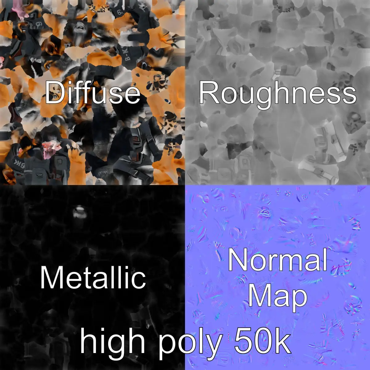 Each model has 3 levels of detail: low-poly, middle-poly, and high-poly, which allows for the use of this model in production rendering (such as 3ds max, Maya, Cinema4d, Blender, Vray/Corona/Cycles and all others), game engines (Unity and Unreal compatible), and interactive presentations, providing a choice of detail based on the LOD System principle. Ideal for use in K9 unit simulations, tactical gaming environments, or virtual reality training. The model's textures are PBR, Diffuse, NormalMap, and reflection/roughness/metallic, which are suitable for any modern rendering engine. All models accurately unwrapped and have no overlapping UV. All textures are 4096*4096 in size. Please like and leave a comment if you enjoyed the model.