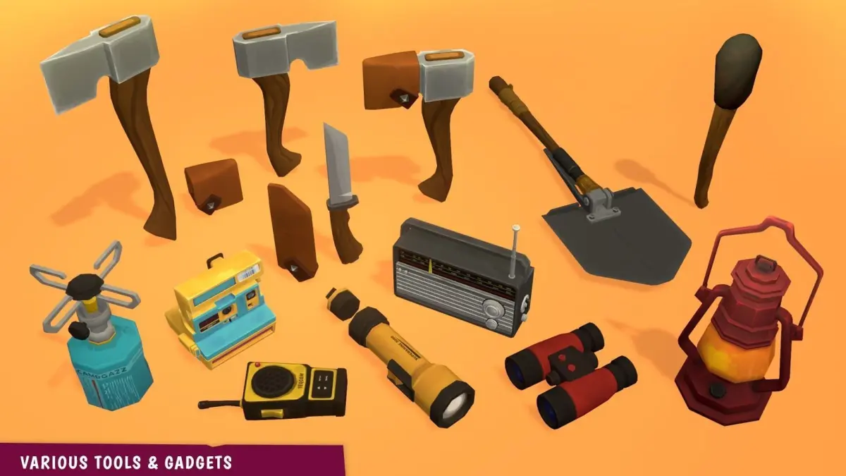 - Tools & Gadgets: 2 axes, axe cover, knife, knife cover, camera, walkie-talkie, flashlight, radio, binoculars, gas lantern, camping shovel, torch, gas cooker, tape, pocket knife, pencil, pen, compass, 3 battery variations