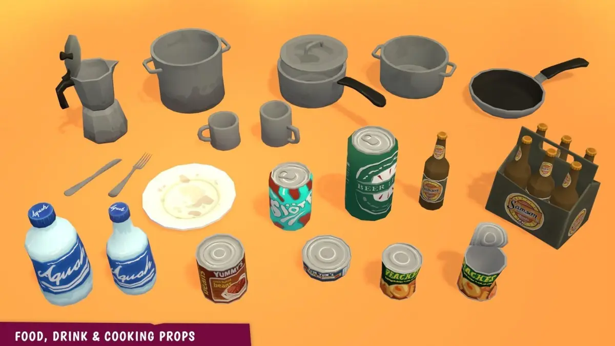 - Cooking: 2 water bottles, beer bottle, beer sixpack, beer can, soda can, baked beans can, tuna can, 2 peach can variations, plate, knife, fork, coffee maker, 3 pots with lid, pan, 2 cups