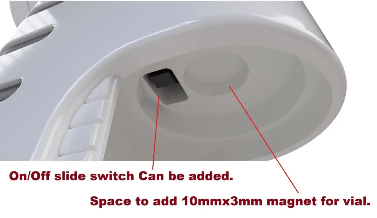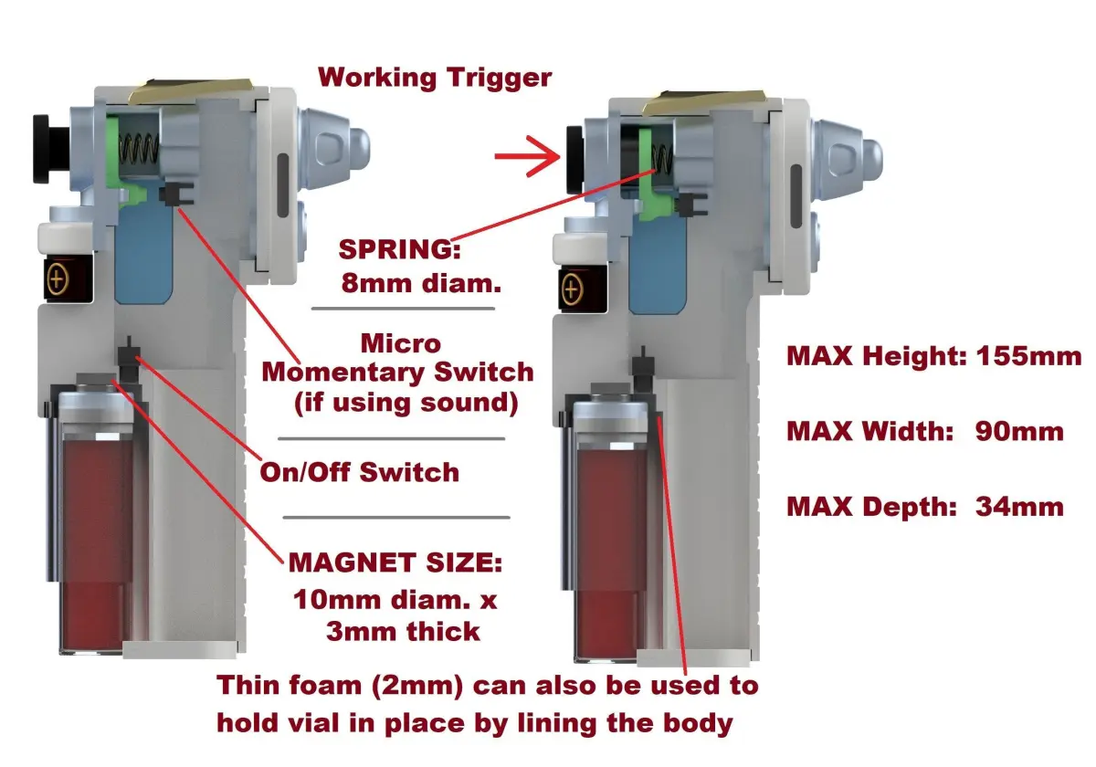 Comes with space inside for lighting and electronics, spring-trigger, round battery holder for 3x AAA, and has removable screw-on base.