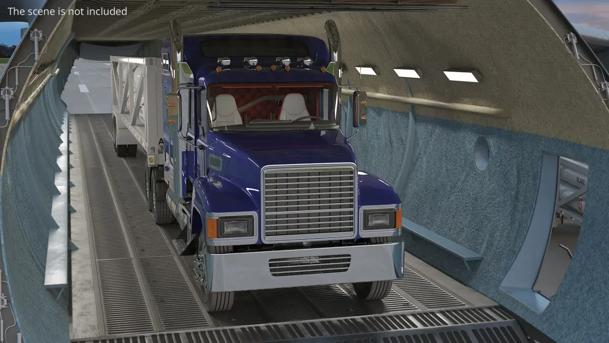 This model features a detailed exterior, including a massive fuselage with a nose that opens to allow for easy loading and unloading. The cargo bay is spacious, accommodating large vehicles like semi-trucks. The aircraft's robust engines are designed for optimal lift and long-haul capabilities, and the landing gear is capable of handling heavy loads.