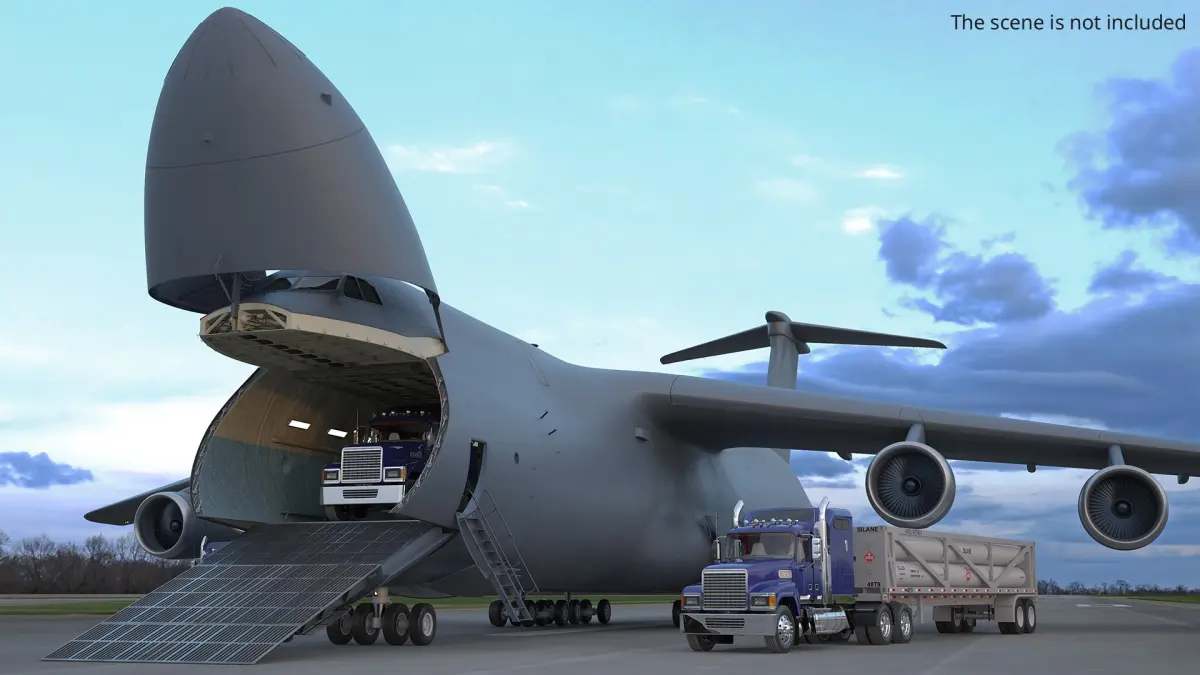 Strategic Airlift Aircraft Nose Raised with Truck Cargo with Interior is a high quality, photo real 3d model that will enhance detail and realism to any of your rendering projects. The model has a fully textured, detailed design that allows for close-up renders, and was originally modeled in 3ds Max 2020 and rendered with V-Ray. Renders have no postprocessing!