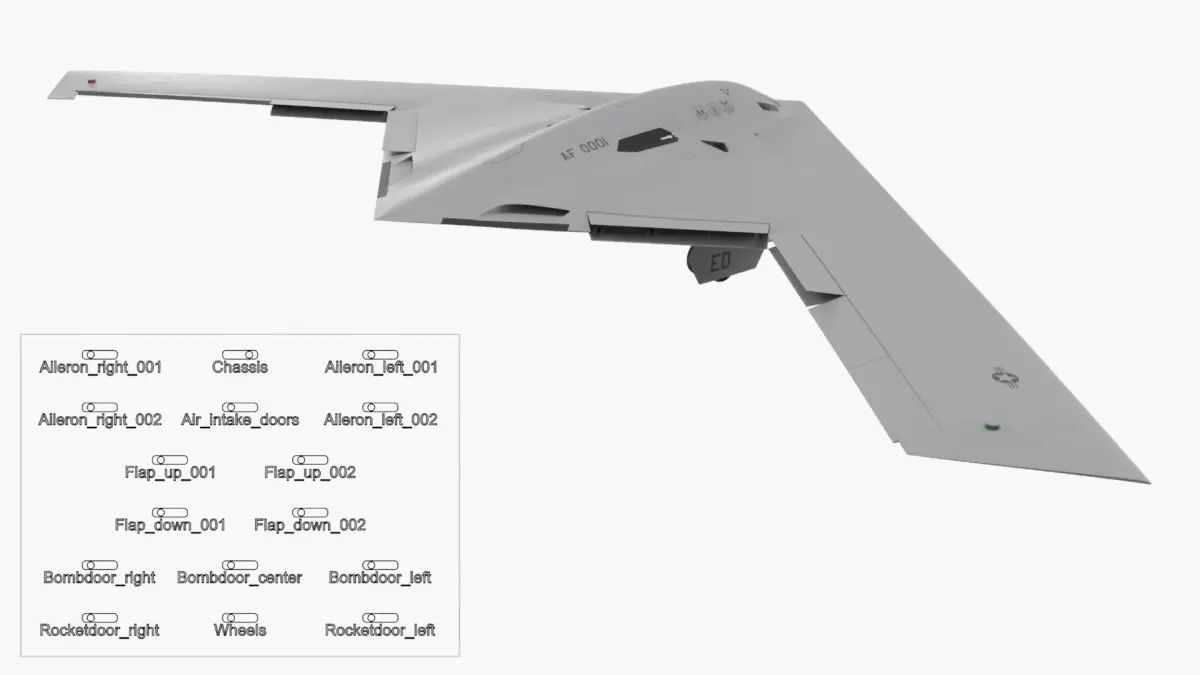 Strategic B-21 Raider Jet White Rigged is fully rigged and is ready to be animated. You can easily position it the way you need or animate it the way your project requires using helpers in 3D Studio Max. See the turntable to get an idea of how rigging works. The pose of the model on the render images is an example and can be recreated using rig, it is not initially included into the product.