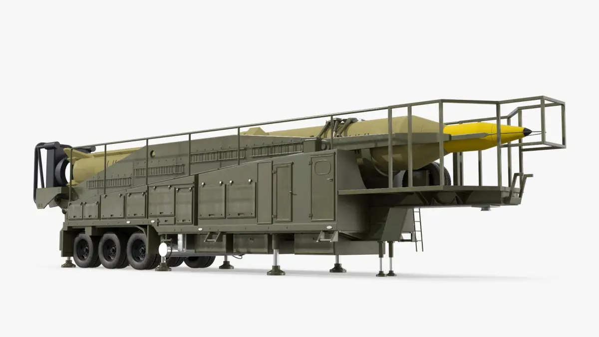 This model showcases a detailed and realistic depiction of a missile system mounted on a transportable launcher. It features intricate components, including the missile itself, the support platform, and the mobility equipment. The launcher is designed for rapid deployment and operation in diverse environments, emphasizing precision and functionality.