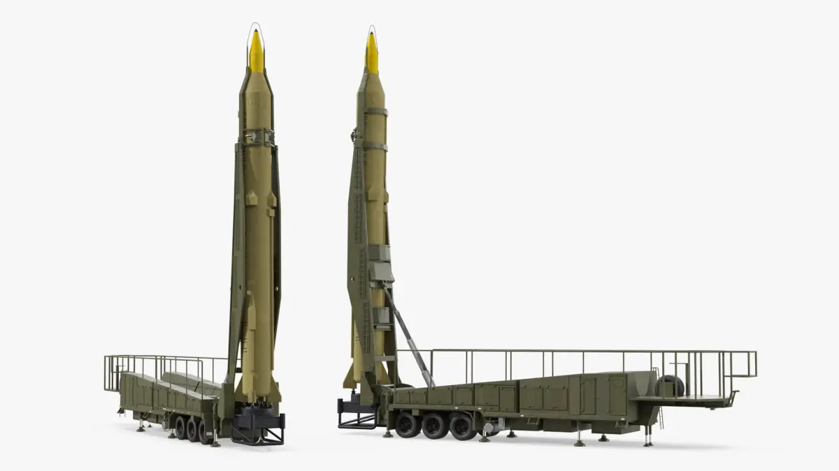 Strategic Missile Launch Trailer Rigged for Maya is a 3d model of a missile on a mobile launch platform, typically used in military applications for strategic offensive capabilities.