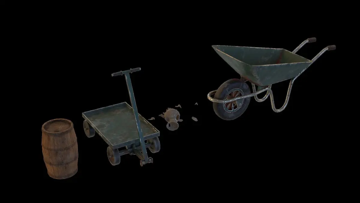 |Cabinet: 495 face, 816 triangles||Pattern table: 23,708 face, 27,116 triangles (500 faces, 1,012 triangles without pattern)||Wheelbarrow: 4,823 face, 6,685 triangles||Handcar: 6.705 face, 8,843 triangles||Big bench: 132 face, 264 triangles||Bench: 848 face, 1,664 triangles||Hammer: 452 face, 816 triangles||Coffe table: 189 face, 312 triangles||Trash: 404 face, 728 triangles||Wooden barrel: 1,616 face, 3,200 triangles||Chair: 764 face, 1,482 triangles||Vase: 1,079 face, 1,177 triangles|